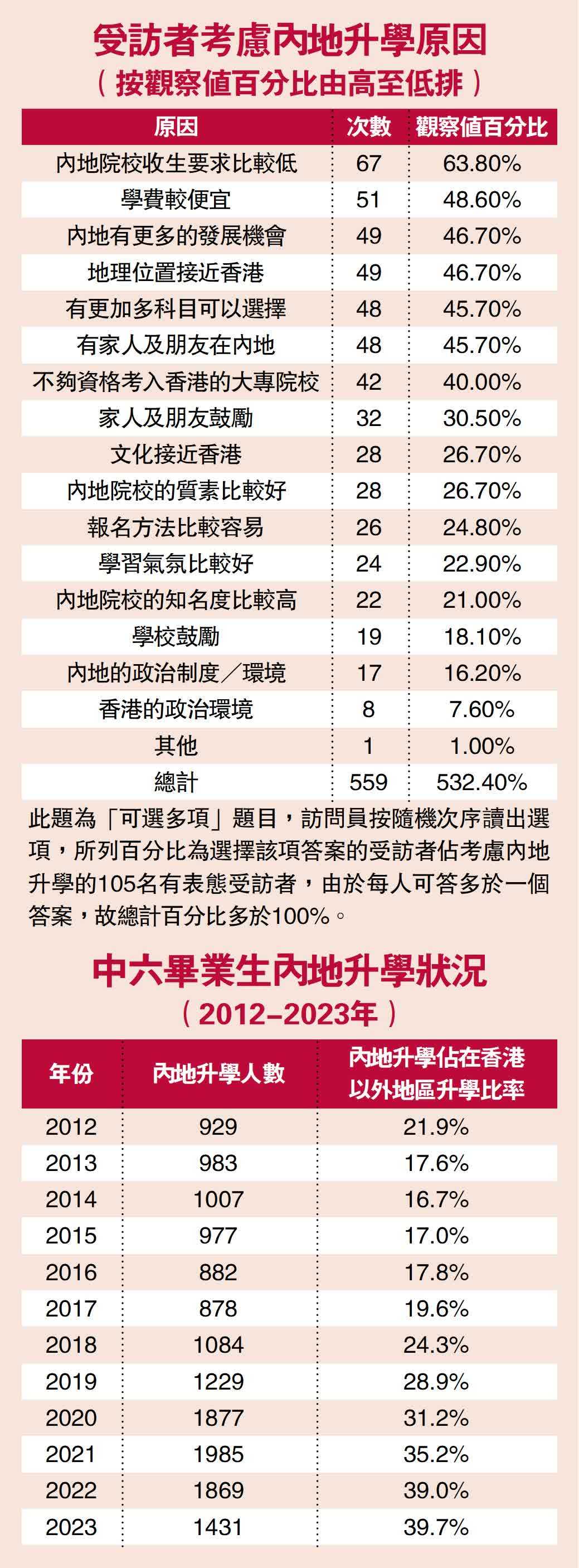 調查結果顯示,中國內地已成為中六畢業生最受歡迎的境外升學目的地,內地升學佔在香港以外地區升學比率由2012年的21.9%上升至2023年的39.7%,為歷年最高,較2014年最低比率的16.7%高出23個百分點。相比2023年英國升學佔比23.3%,台灣升學佔比12.1%。
