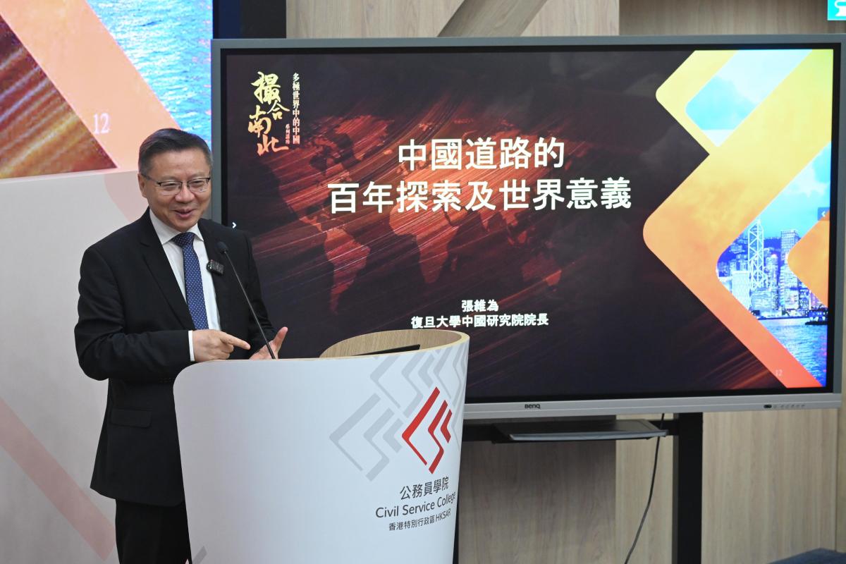 【點新聞報道】公務員學院舉辦「撮合南北:多極世界中的中國系列」講座,今日(15日)在公務員學院舉行首場以「中國道路的百年探索及世界意義」為題的講座,由復旦大學中國研究院院長張維為教授主講,復旦大學中國研究院諮詢委員會主任李世默擔任主持。