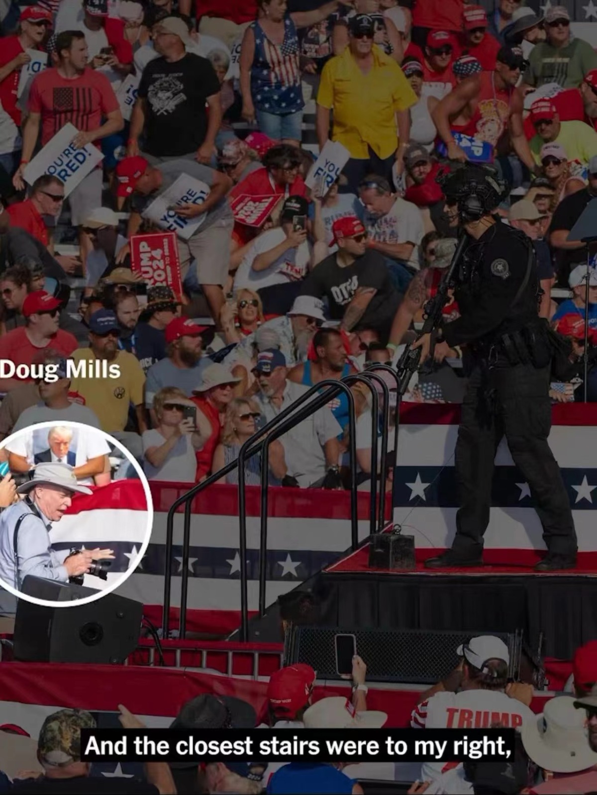 米爾斯稱,他報道總統已有40多年了,一直清楚他們從哪條路上台,從哪條下台。最近的樓梯在他的右邊,所以他跑到那邊親眼目睹特朗普被扶起來,他的第一個反應是「天啊!他還活着!」