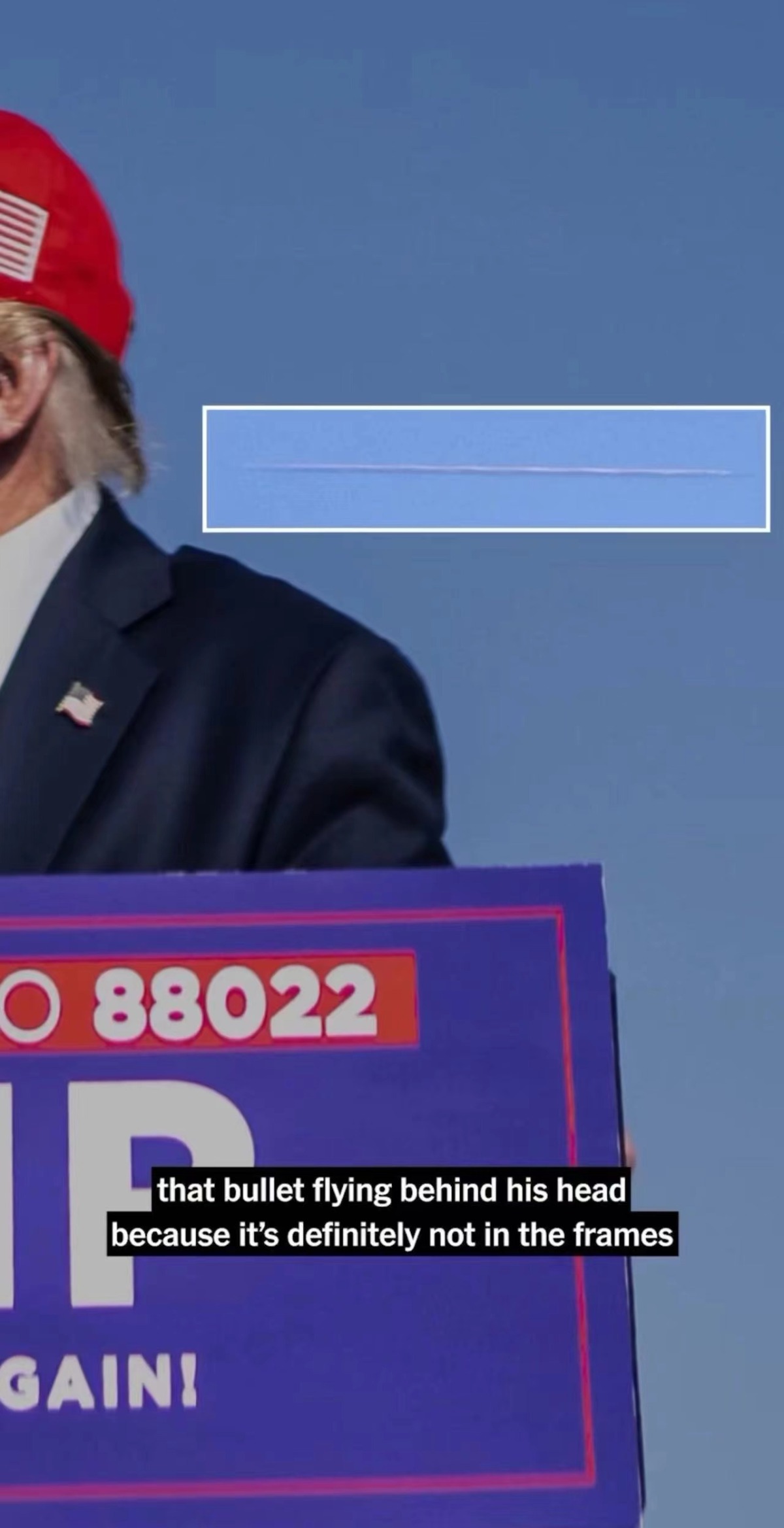 從圖片中可看出,子彈快速發射的彈道衝擊波軌跡清晰明顯,即位於特朗普耳朵右方的一條白線,離特朗普的耳朵近在咫尺,因此如果不是特朗普「偏頭」正好救了他一命,子彈將會按照運行軌跡直接擊中其太陽穴。