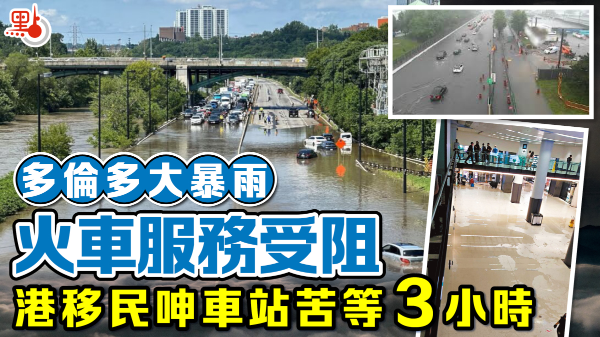 從事金融業的港人William因位於市中心的辦事處停電而提早放工,但他乘火車的全國最繁忙鐵路樞紐聯合車站地庫大堂亦有水浸情況,樓梯變成小瀑布,來往聯合車站的火車服務受阻。結果他在車站等候3小時,整個車站逼滿候車人群。William憶述多倫多上一次豪雨是在2013年,但政府在11年來未見改善基建,令到居民這次再遇阻滯。暴雨亦導致部分多倫多地鐵站關閉,一些路段服務暫停。