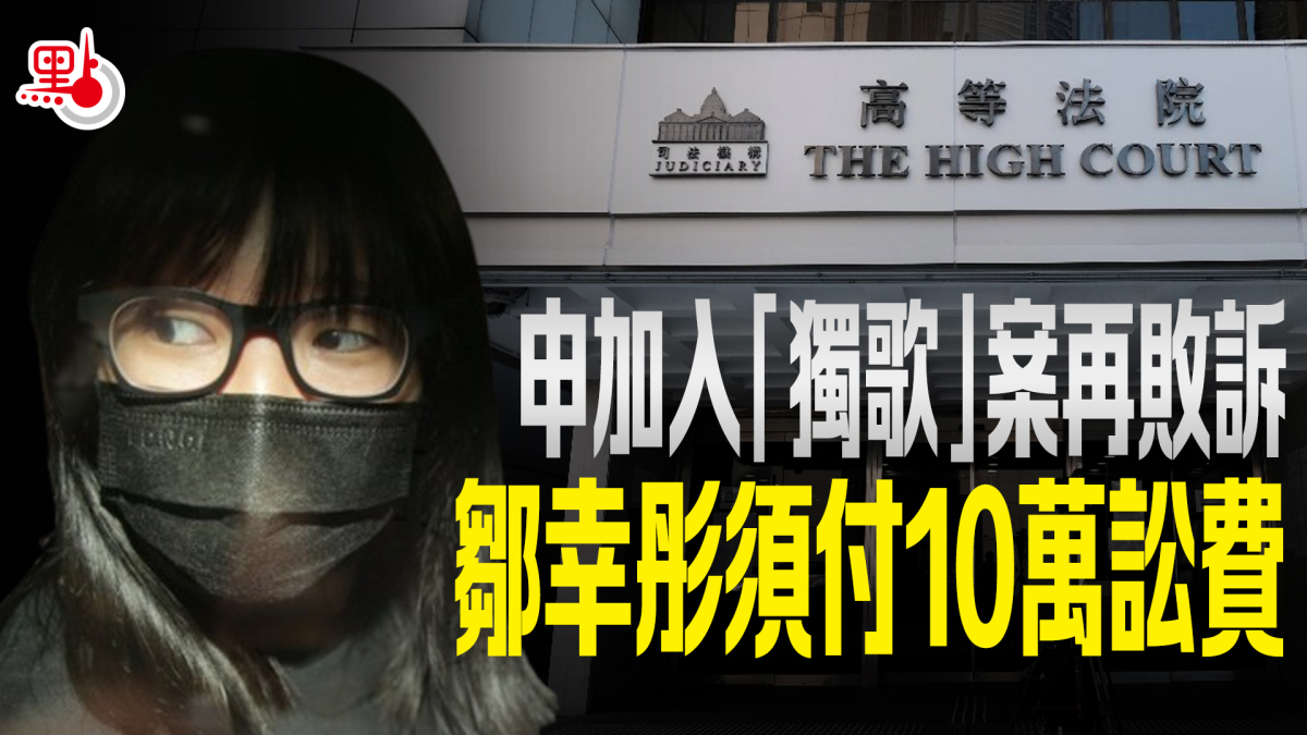 律政司去年就黑暴「港獨」歌向法庭申請禁制令,已解散的反中亂港組織「支聯會」頭目鄒幸彤申請加入訴訟,被高院原訟庭法官陳健強拒絕兼判她付訟費。鄒幸彤其後向上訴庭申請上訴許可,高等法院首席法官潘兆初及上訴庭副庭長朱芬齡昨日頒下判詞,拒絕向鄒批出上訴許可,並下令鄒須支付律政司10萬元訟費。