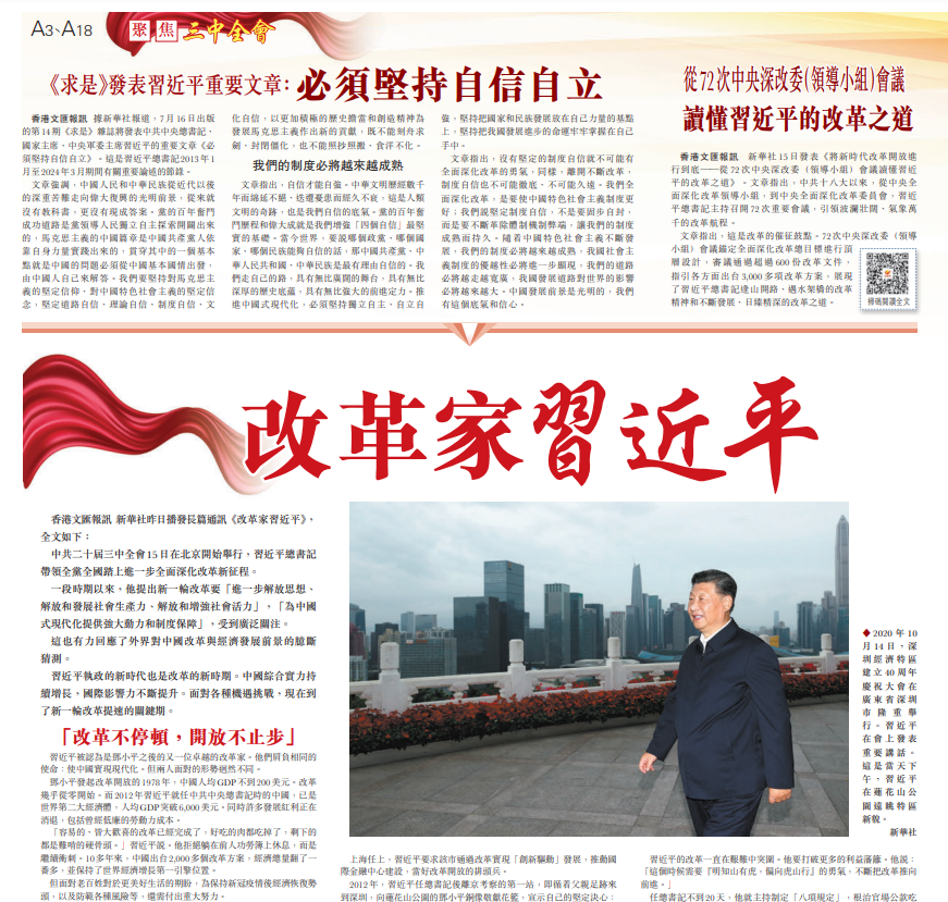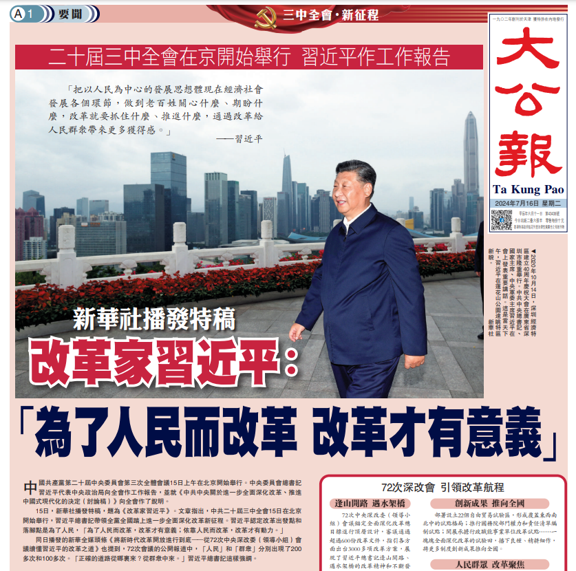 中共二十屆三中全會7月15日舉行當天,新華社對外播發人物特稿《改革家習近平》,《大公報》和香港《文匯報》都予以轉載,在港澳地區讀者中引起強烈反響。