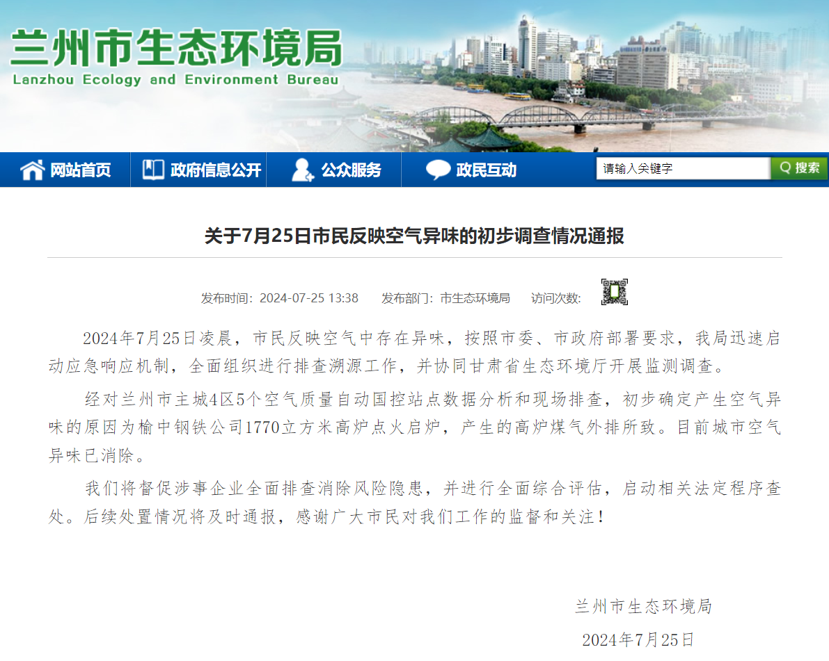 經對蘭州市主城4區5個空氣質量自動國控站點數據分析和現場排查,初步確定產生空氣異味的原因為榆中鋼鐵公司1770立方米高爐點火啟爐,產生的高爐煤氣外排所致。目前城市空氣異味已消除。蘭州市生態環境局將督促涉事企業全面排查消除風險隱患,並進行全面綜合評估,啟動相關法定程序查處。後續處置情況將及時通報。