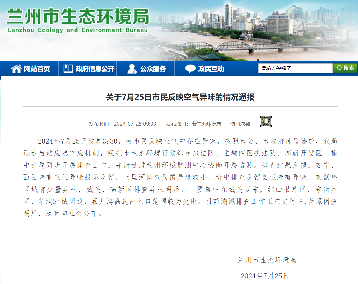 【點新聞報道】蘭州市生態環境局今日(25日)發布情況通報稱,2024年7月25日凌晨,蘭州市民反映空氣中存在異味,按照蘭州市委、市政府部署要求,蘭州市生態環境局迅速啟動應急響應機制,全面組織進行排查溯源工作,並協同甘肅省生態環境廳開展監測調查。