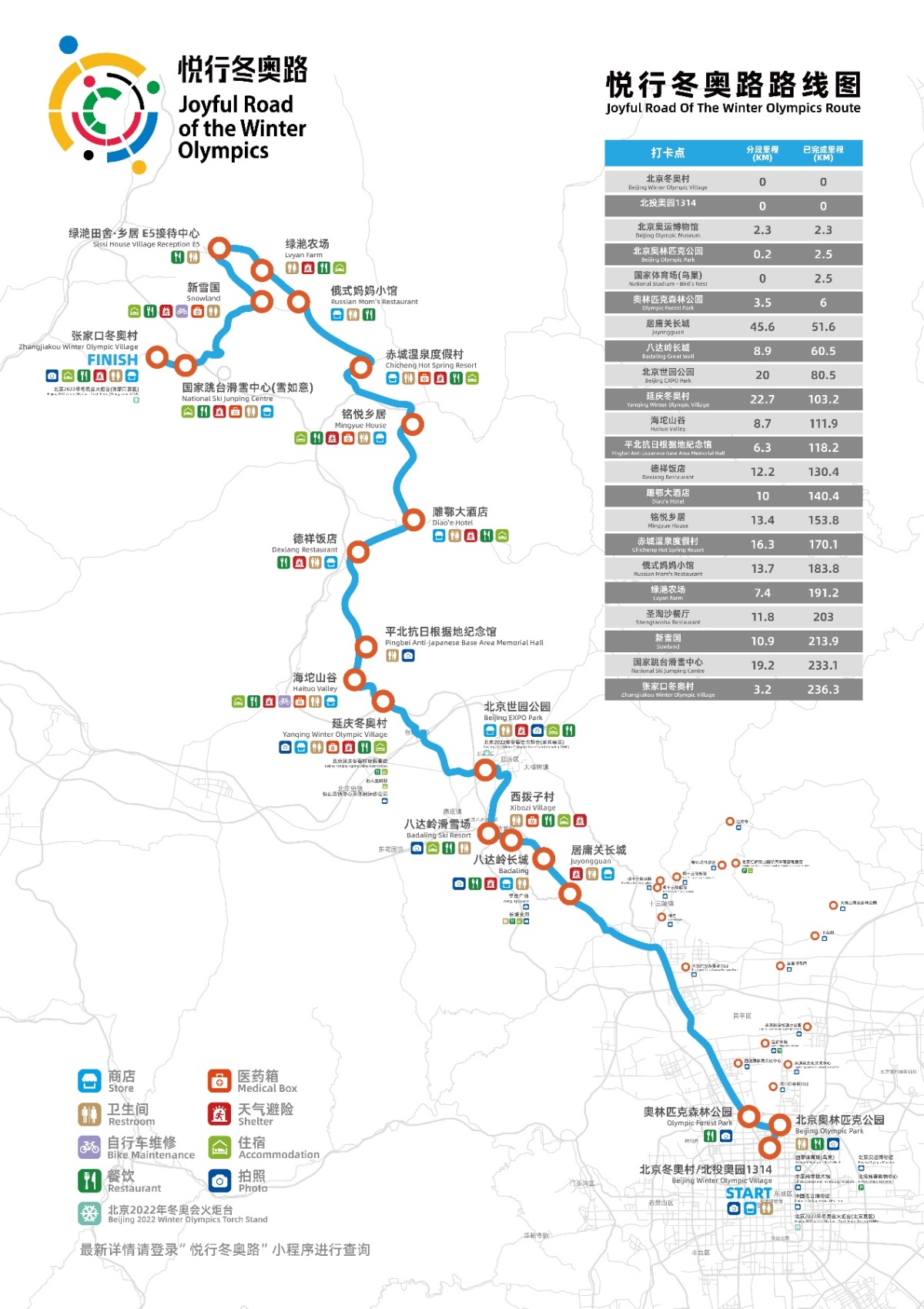 「悅行冬奧路」自助賽道以北京冬奧村為起點,以張家口冬奧村為終點,全長236.3KM,沿途共19個打卡服務點及3個特色打卡點,途徑北京奧林匹克公園(北京奧運博物館)、居庸關長城與八達嶺長城等京張兩地三賽區冬奧核心區及沿線知名旅遊景區。
