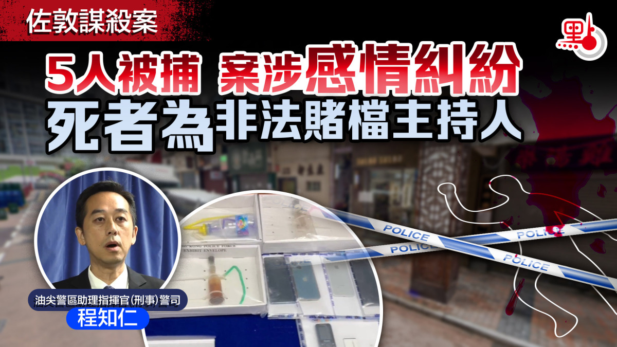 【點新聞報道】佐敦昨日(28日)發生謀殺案。警方昨日早上約6時接報,指一名33歲男子昏迷並倒臥於佐敦庇利金街61-63號外,送院後證實不治。經調查後,警方拘捕2男3女,年齡介乎32至56歲,其中2人涉嫌「謀殺」,其餘3人涉嫌「協助罪犯」罪。