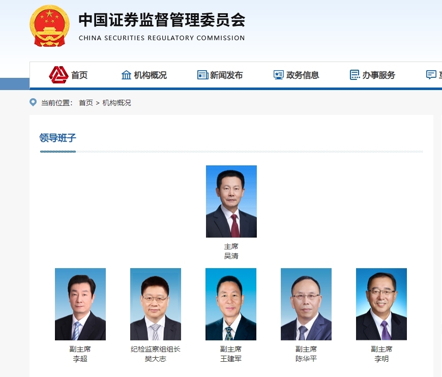 據中國證監會網站顯示,目前中國證監會主席、黨委書記為吳清。中國證監會副主席共有四位,分別是李超、王建軍、陳華平、李明。樊大志現任中央紀委國家監委駐中國證監會紀檢監察組組長,中國證監會黨委委員。