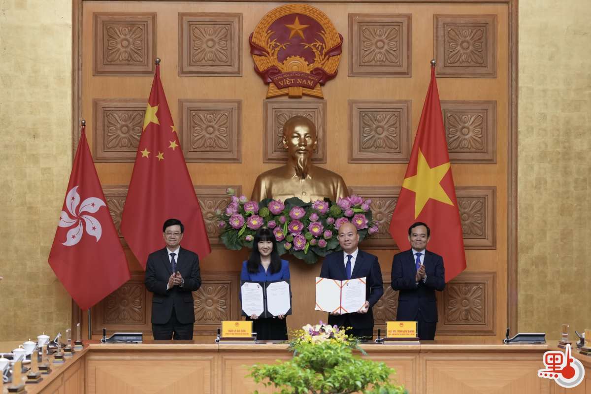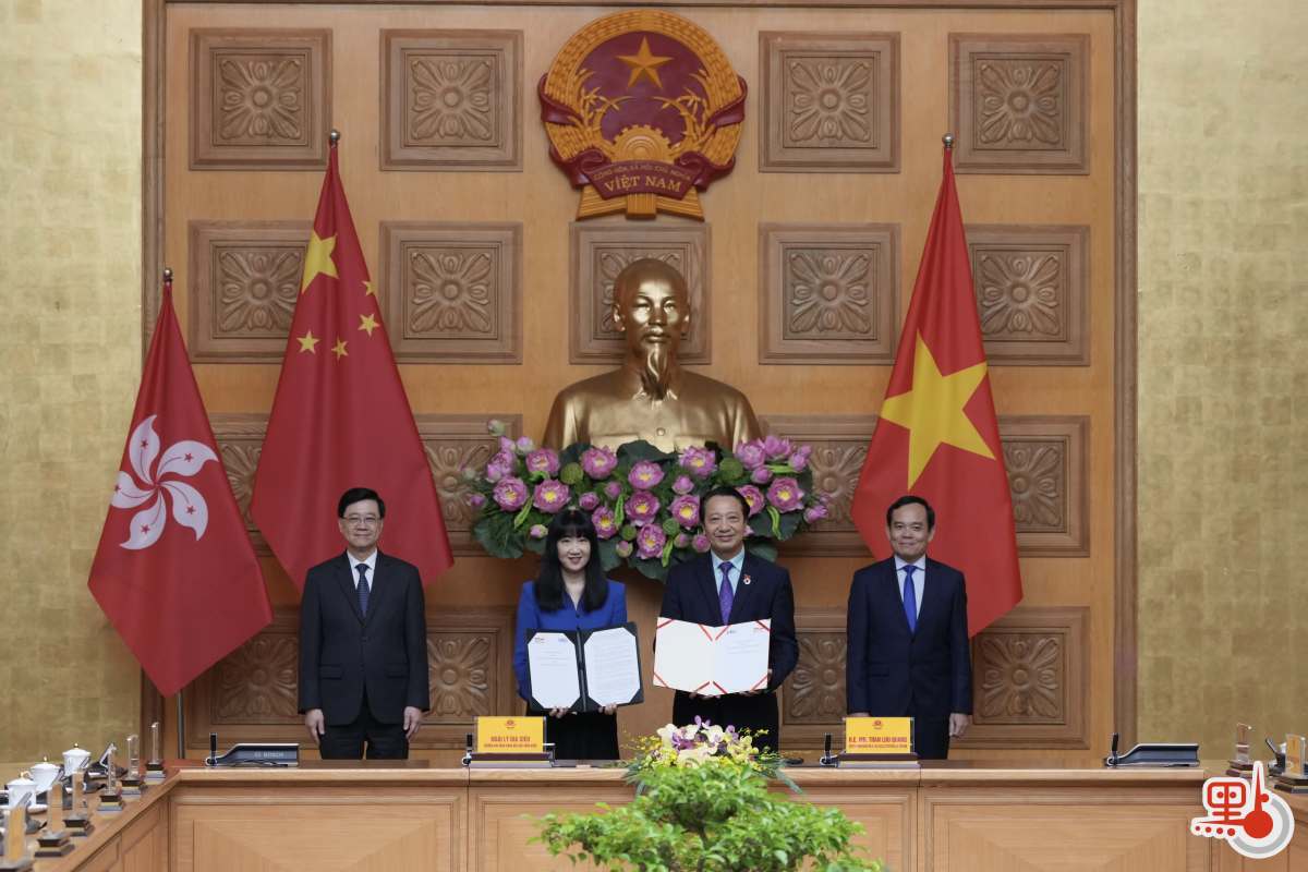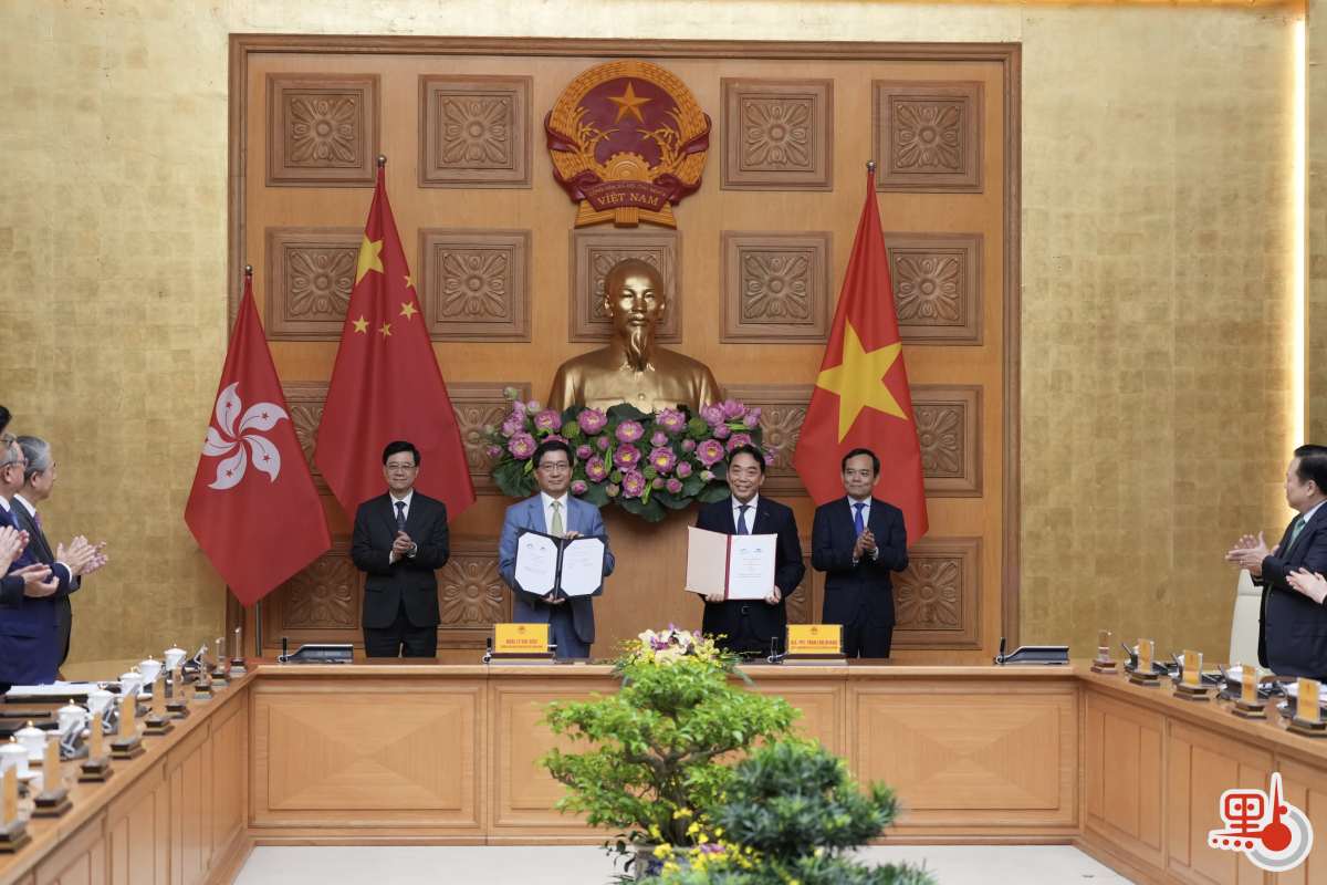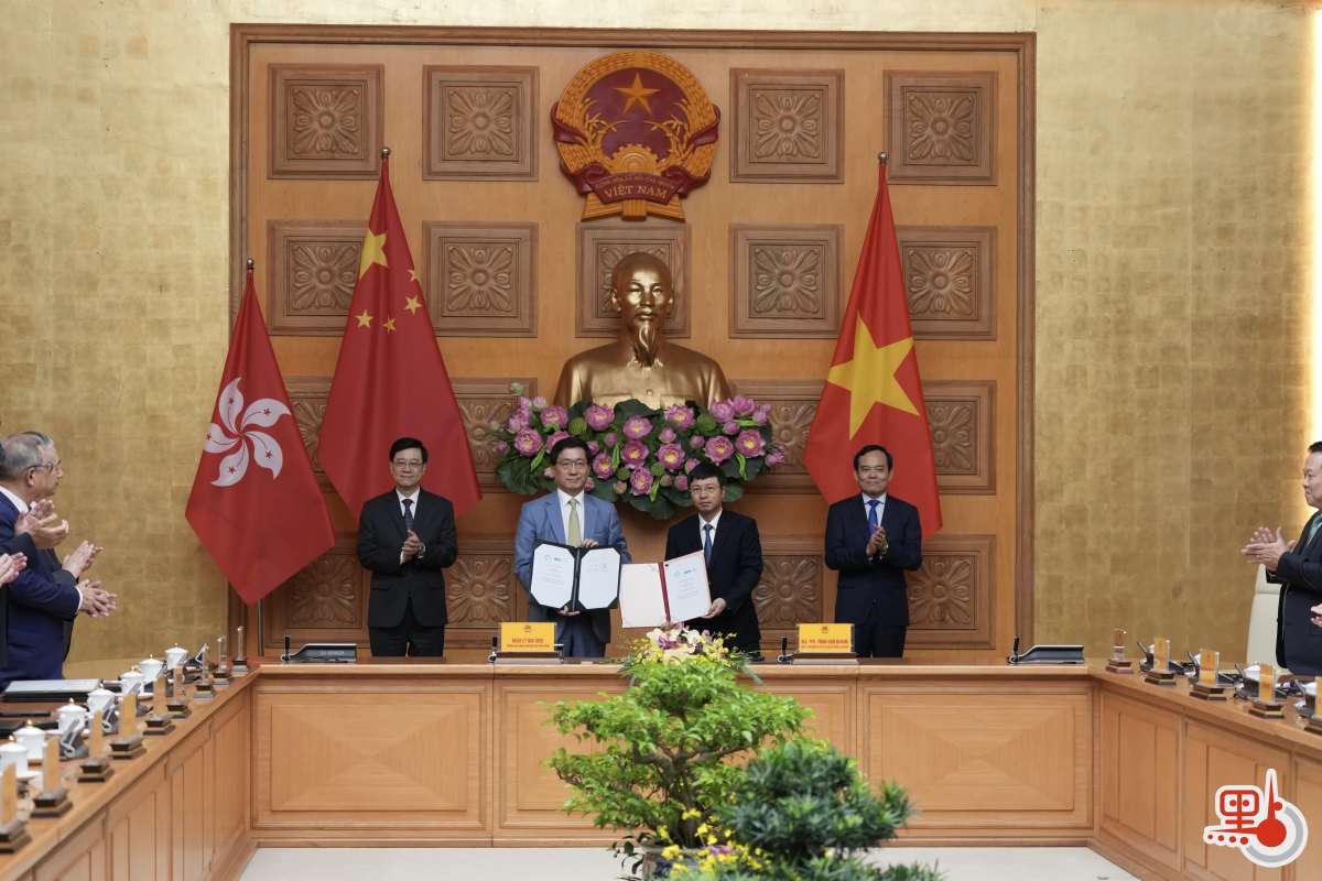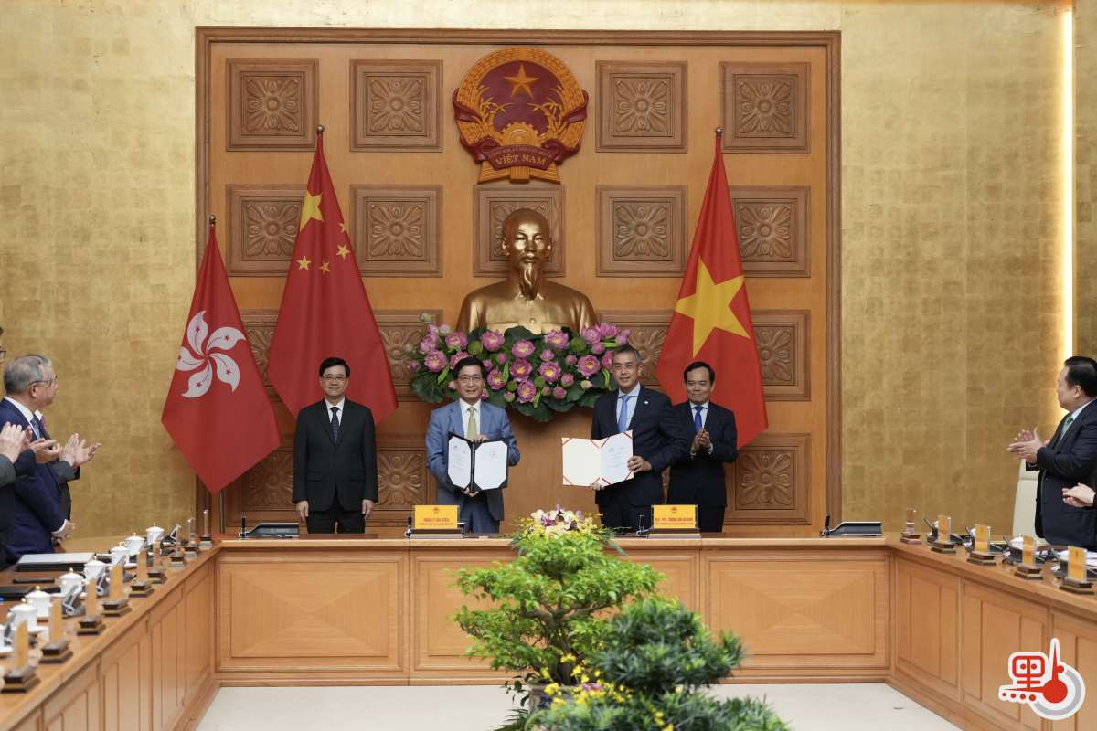 李家超表示,今次是首次以香港特首身份到訪越南,很期待今次的行程,因此帶同30多位來自香港不同行業人士到訪。他又指,香港現在正全力拚經濟、謀發展,期待兩地展開更深入合作。其後,在李家超及陳流光的共同見證下,雙方代表共同簽署8份合作備忘錄,涉及金融、貿易、投資及航空等領域。