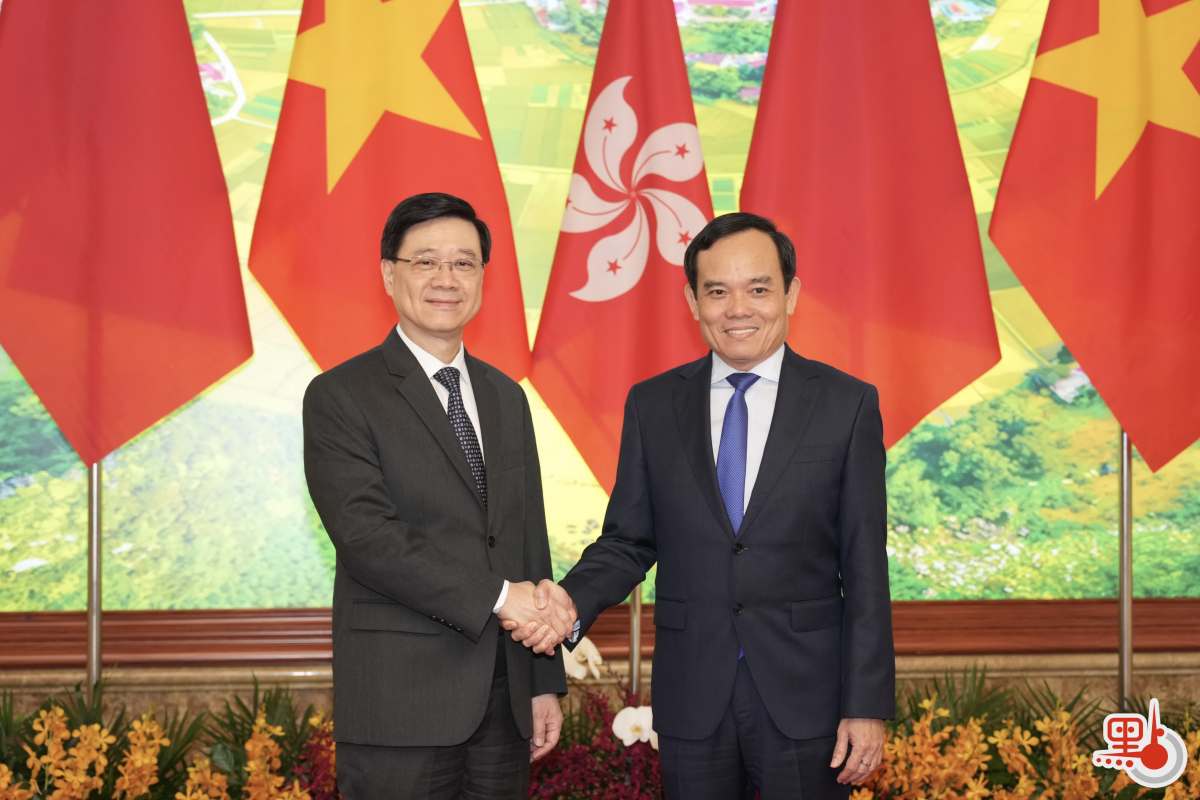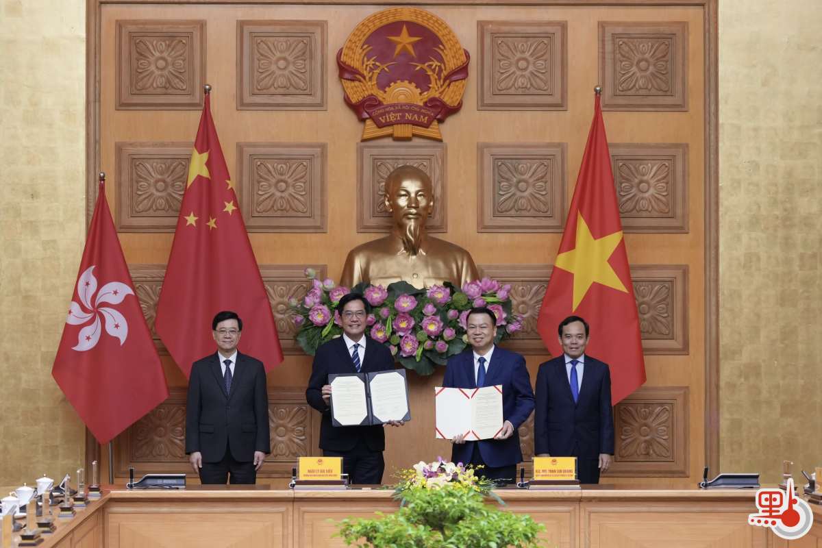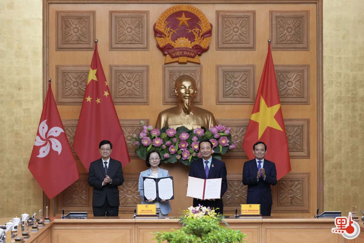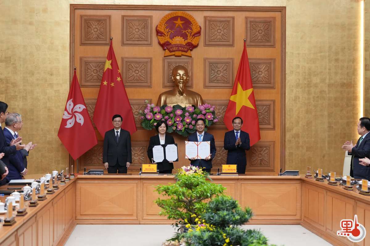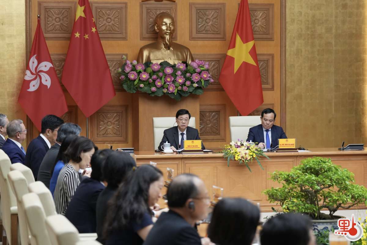 李家超表示,今次是首次以香港特首身份到訪越南,很期待今次的行程,因此帶同30多位來自香港不同行業人士到訪。他又指,香港現在正全力拚經濟、謀發展,期待兩地展開更深入合作。其後,在李家超及陳流光的共同見證下,雙方代表共同簽署8份合作備忘錄,涉及金融、貿易、投資及航空等領域。