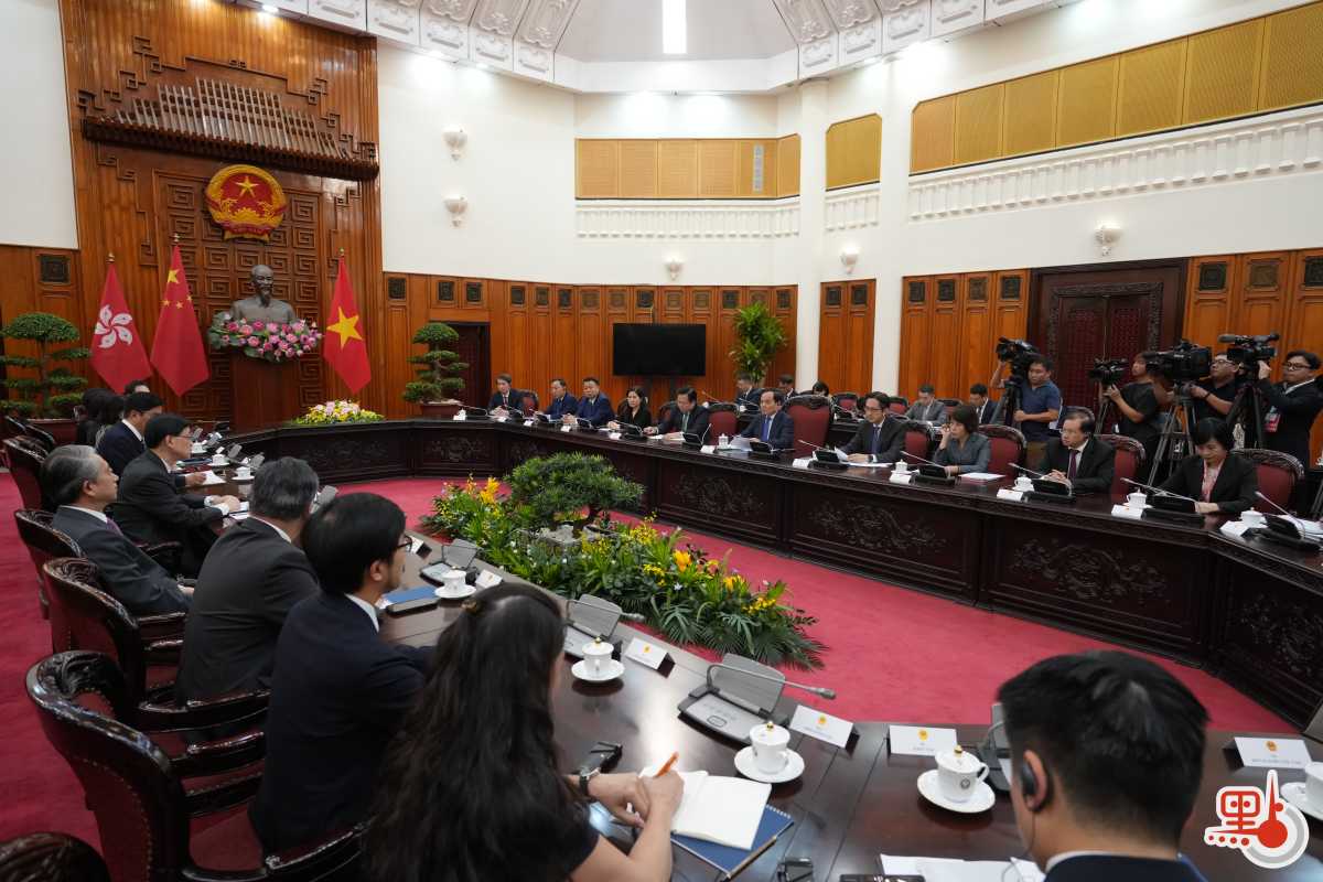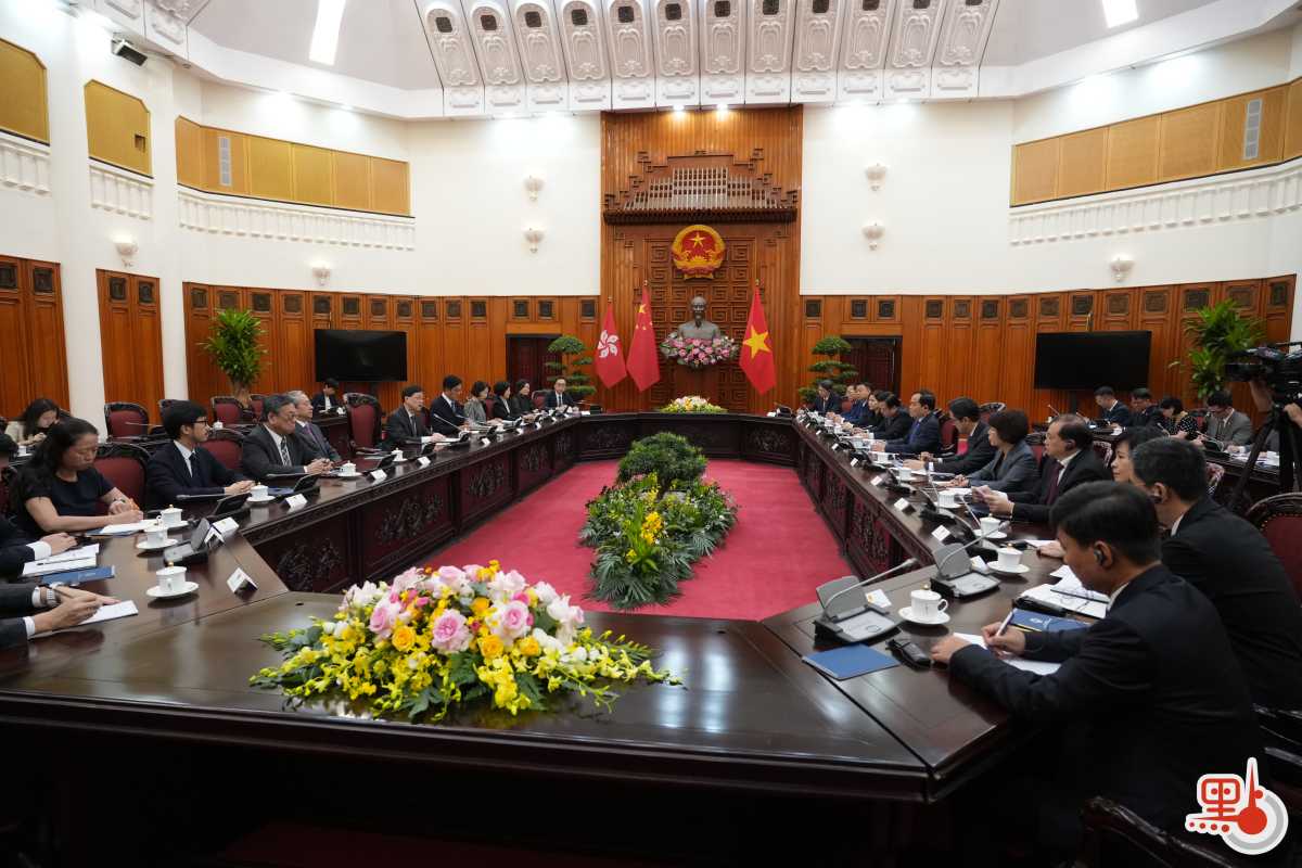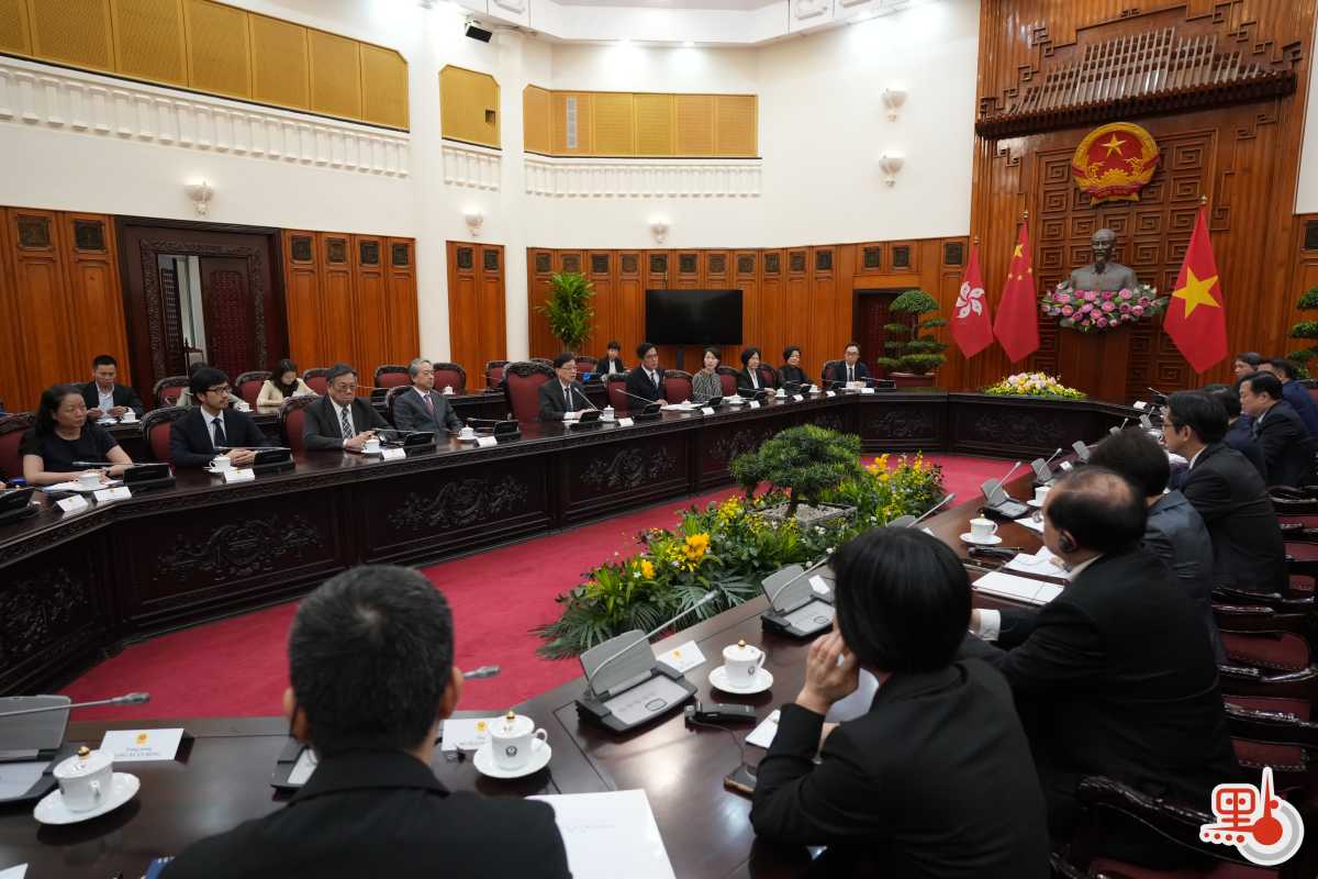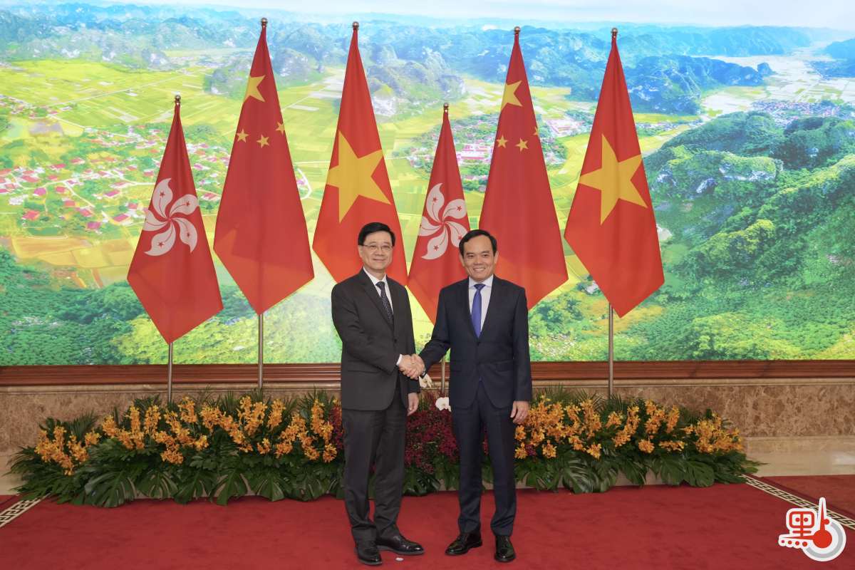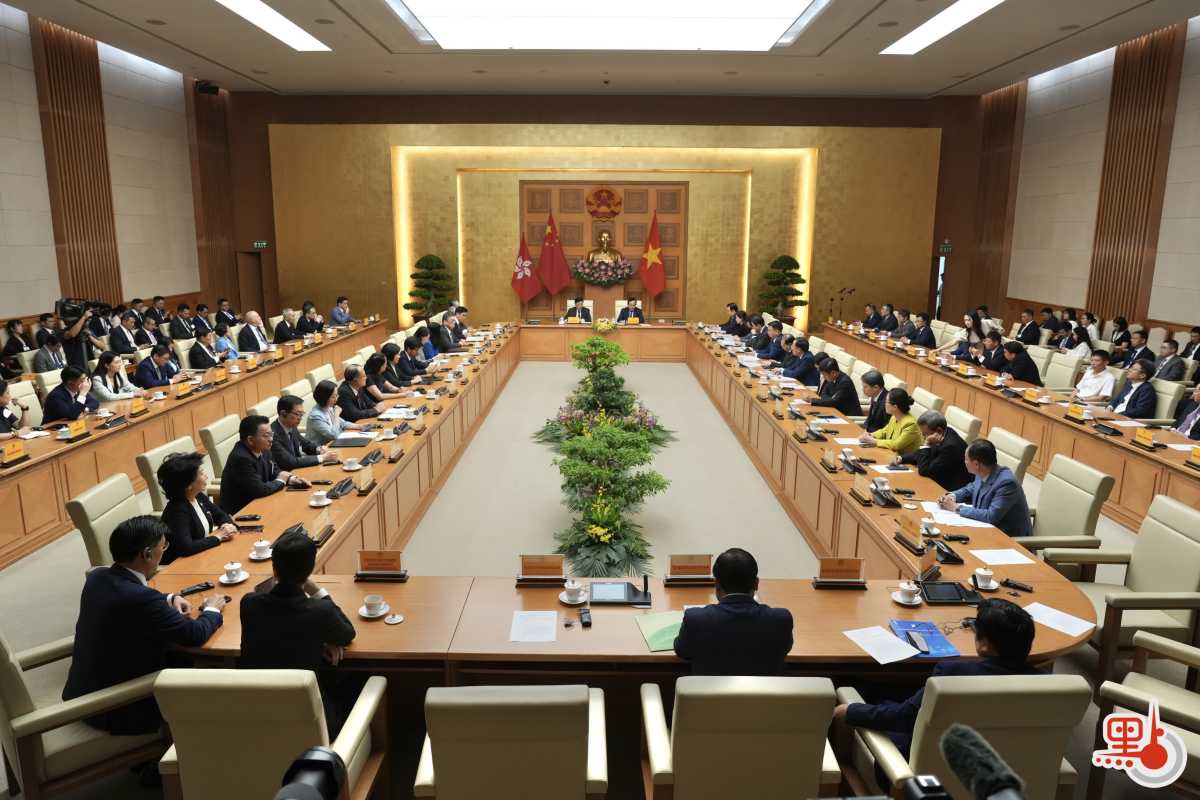李家超表示,今次是首次以香港特首身份到訪越南,很期待今次的行程,因此帶同30多位來自香港不同行業人士到訪。他又指,香港現在正全力拚經濟、謀發展,期待兩地展開更深入合作。其後,在李家超及陳流光的共同見證下,雙方代表共同簽署8份合作備忘錄,涉及金融、貿易、投資及航空等領域。