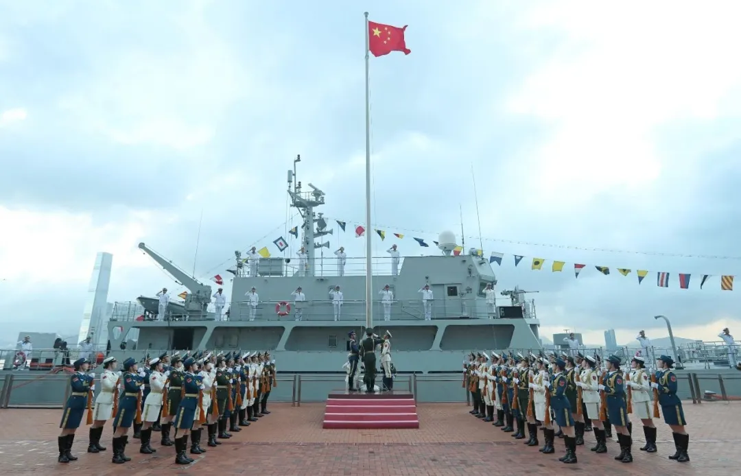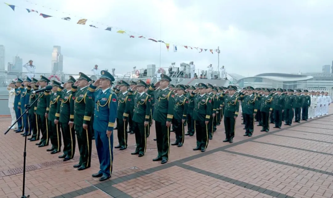 清晨,中區軍用碼頭駐香港部隊海軍艦艇抵岸靜泊、滿旗高懸,陸海空三軍官兵代表軍姿颯爽、整齊列隊。來隊探親的家屬們莊嚴肅立,與官兵一同迎接國旗的到來。
