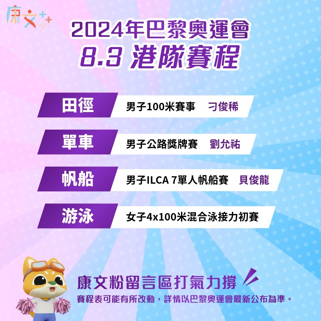 【點新聞報道】今屆巴黎奧運港隊運動員在多個項目分途出擊,力爭好成績,包括今日初次登場的田徑及單車代表刁俊稀同劉允祐,令人期待。另外,今日香港女子游泳隊亦會亮相4x100米混合泳接力。