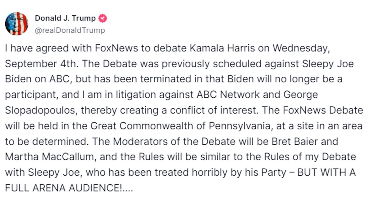 特朗普在其社交平台「Truth Social」發文稱已經與福克斯新聞達成協議,將於9月4日與哈里斯進行辯論。他提到,這場辯論原定在美國廣播公司(ABC)與「瞌睡喬」(Sleepy Joe)進行,但由於拜登不再參加競選,辯論也就隨之終止。特朗普表示,辯論規則將與6月27日拜登、特朗普在CNN舉行的辯論相似。