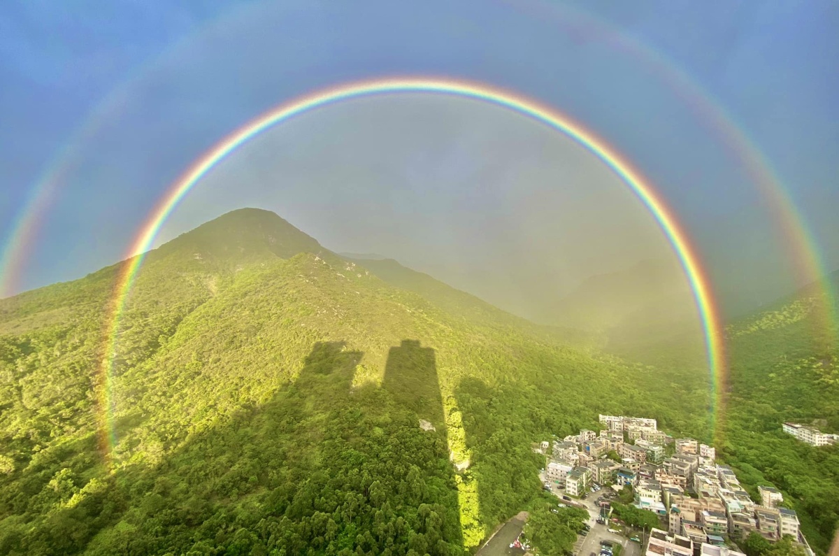 有網友近日在天文台社區天氣觀測計劃CWOS群組分享相片,指7月30日在東涌拍下這一美景,瞬間呃到逾萬like。天文台指,大家平時多數見到的都是弧形彩虹,接近圓形的彩虹難得一見,「何況仲要係雙!彩!虹!」。