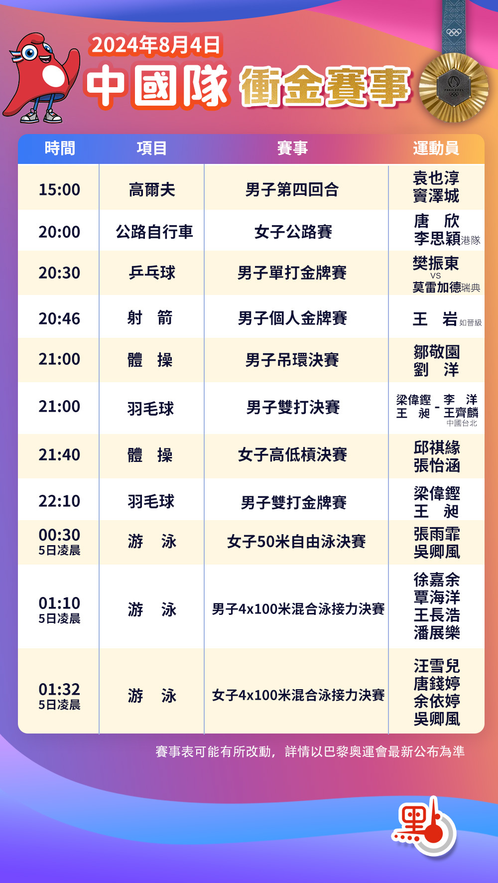 游泳比賽當日還將進行男子和女子4x100米混合泳接力決賽。在東京奧運會上,中國隊獲得女子4x100米混合泳接力第四名,預賽第三的中國男隊因決賽犯規被取消成績。