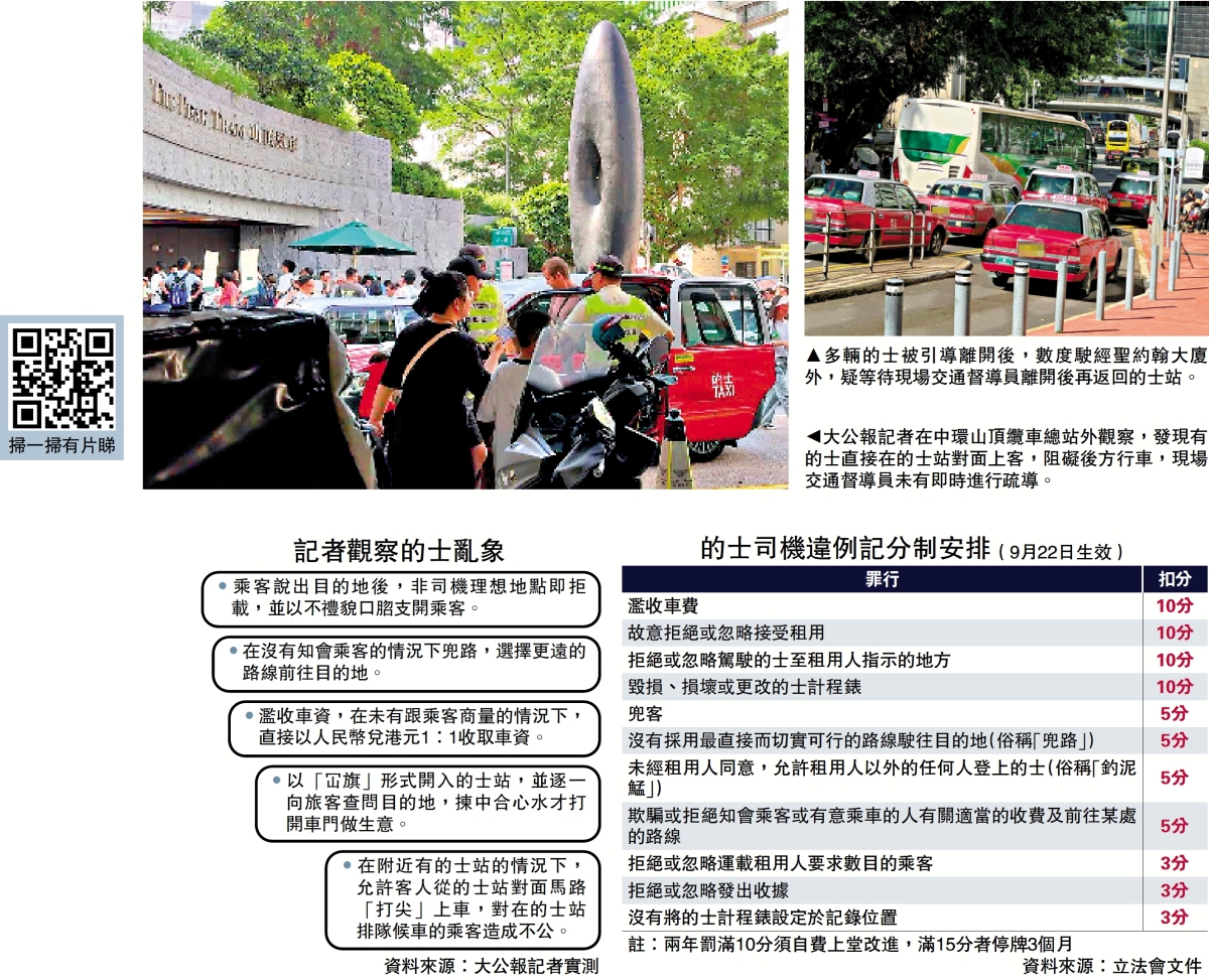 為打擊的士業內的害群之馬,提升整體的士服務質素,政府下月實施的士司機違例記分制,並引入優質的士車隊,最快下月起有首批車隊投入服務。不過,大公報記者近日以遊客身份,在多個地點實測發現的士業依然亂象多多。有的士司機公然兜路,提供電子支付但以人民幣1:1折算港幣,一程車費多收近40港元車資;有的士司機公然拒載,且態度惡劣地表明只做「過海客」,着令乘客「不過海的那邊排隊,去去去!」有的士司機在的士站揀客,聽到滿意的目的地,才打開車門讓乘客登車。
