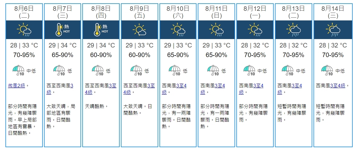 天文台指,高空反氣旋正覆蓋華南,本港下午天氣極端酷熱,此外高溫觸發的驟雨及雷暴正影響廣東。天文台預料,高空擾動會在明日(6日)為廣東沿岸帶來驟雨,展望明日天氣酷熱,有幾陣驟雨,隨後兩三日持續天晴酷熱。受高空反氣旋影響,本周中至後期華南地區普遍晴朗,天氣持續酷熱。隨着高空反氣旋逐漸減弱及受西南氣流影響,周末至下周初廣東沿岸有幾陣驟雨。