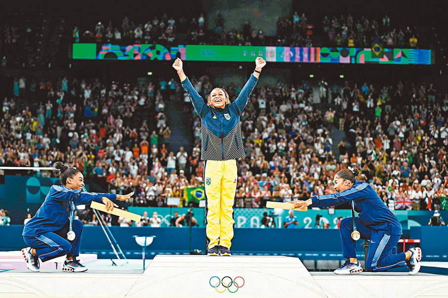 巴黎奧運女子自由體操決賽於周一(8月5日)上演,結果由巴西選手安德拉德贏得金牌,美國名將拜爾斯摘得銀牌。在頒獎儀式上,拜爾斯和銅牌的美國隊友崔爾斯一起屈膝蹲下,向最高領獎台上的安德拉德致敬,這個畫面令安德拉德儼然成為巴西「奧運女王」。
