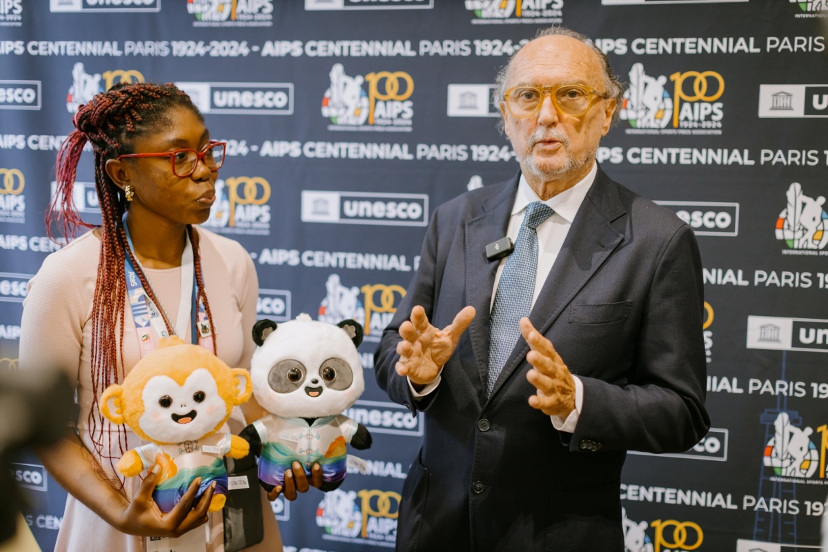 【點新聞報道】北京時間8月6日下午,正值巴黎奧運會舉辦期間,成都世運會吉祥物「蜀寶」「錦仔」亮相國際體育記者協會(AIPS)成立100周年巴黎紀念活動。「大熊貓是最能代表成都的動物,而川金絲猴則充滿了無限的生機與活力。」AIPS主席吉亞尼·梅羅說,成都世運會吉祥物旨在呼籲大家關愛珍稀動物、關注生物多樣性保護,與世運會注重環保與可持續理念相契合。