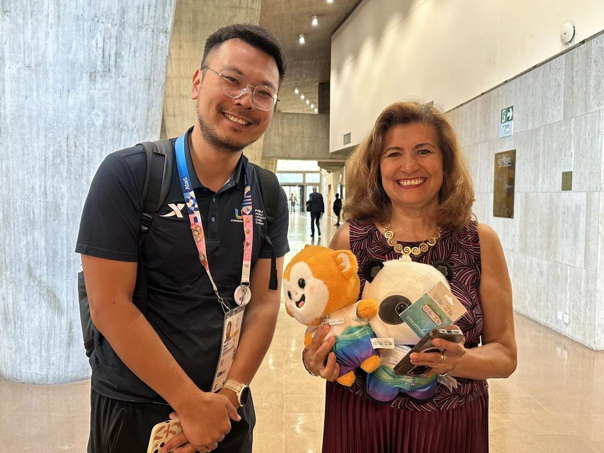 當「蜀寶」和「錦仔」出現在現場大屏幕時,立刻成為關注焦點,吸引了無數嘉賓與之合影。聯合國教科文組織社會科學及人文科學部門助理總幹事加布里埃拉·拉莫斯,盛讚成都世運會吉祥物「令人驚艷」。法國體育、奧運會和殘奧會部長阿梅莉·烏代亞-卡斯泰拉則一邊學着「蜀寶」和「錦仔」的中文發音,一邊表示:「它們真的太漂亮了!我真心地祝願成都世運會成功舉辦。」妮可·大衛是來自馬來西亞的壁球傳奇選手,被譽為「世運會史上最佳運動員」,她對於「蜀寶」「錦仔」愛不釋手:「太可愛了,相信明年的成都世運會上,很多運動員都會為了能夠得到它們而在賽場上拚盡全力。」