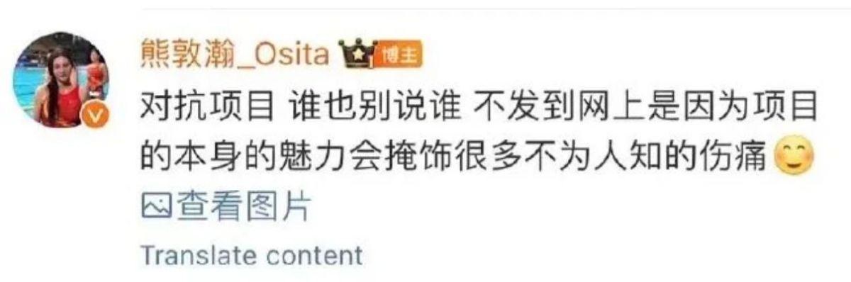 在曬出自己曾經受傷照片後,有網友對她進行了關心。熊敦瀚則表示:「不用啦!水球運動員或多或少身上都有點傷,而且如果我沒記錯這應該是很早以前的事情了。」