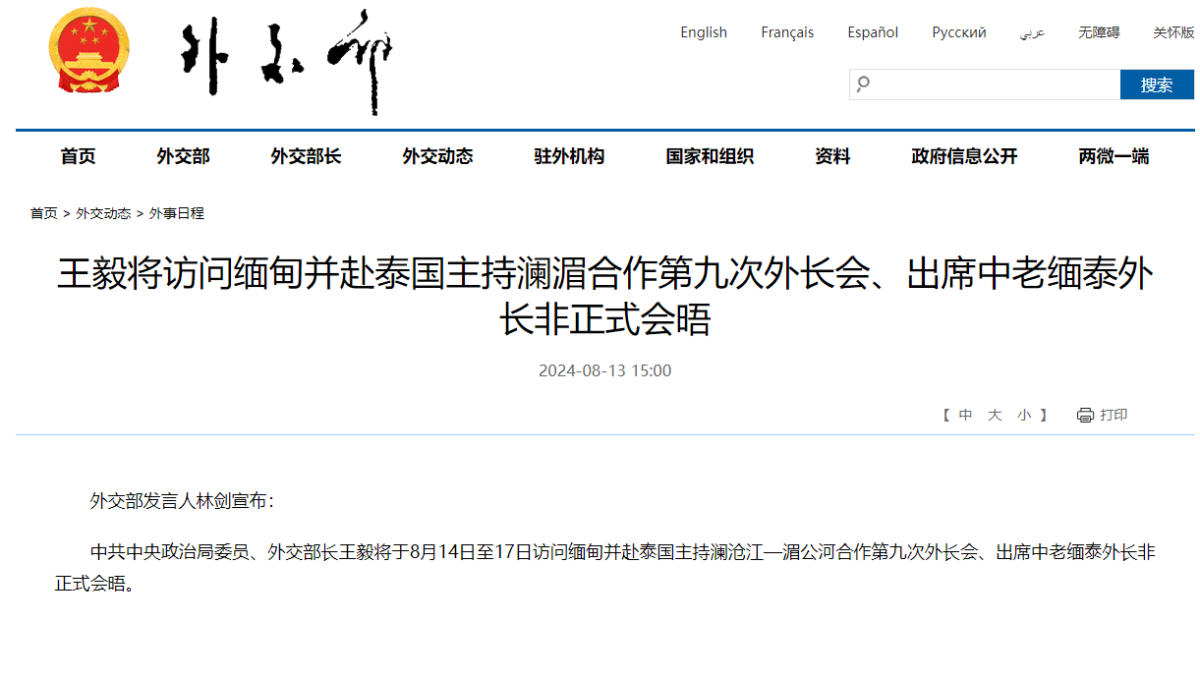【點新聞報道】據外交部網站今日(13日)消息,外交部發言人林劍宣布,中共中央政治局委員、外交部長王毅將於8月14日至17日訪問緬甸並赴泰國主持瀾滄江—湄公河合作第九次外長會、出席中老緬泰外長非正式會晤。