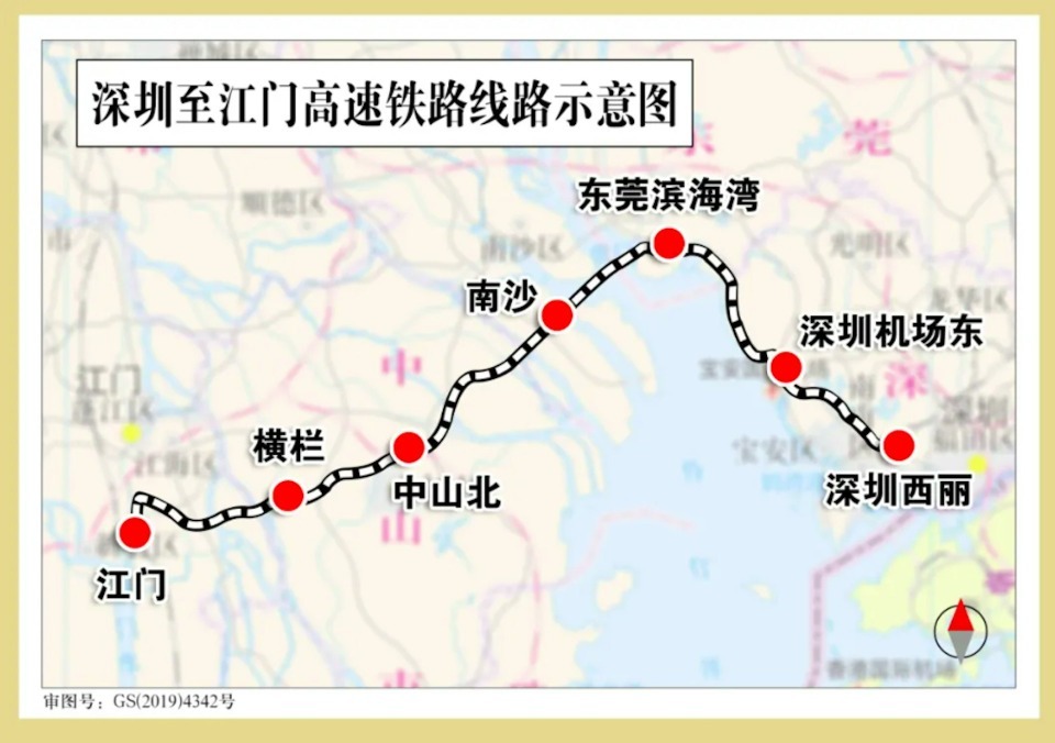 深圳至江門鐵路(含先期開工段珠江口隧道)新建正線全長約116公里,其中橋樑69公里,隧道45公里(含地下站長度)。全線共設西麗、深圳機場東、濱海灣、南沙、中山北、橫欄、江門共7座車站。其中西麗、深圳機場東為地下站,濱海灣、南沙、中山北、橫欄為高架站,江門站為地面站。
