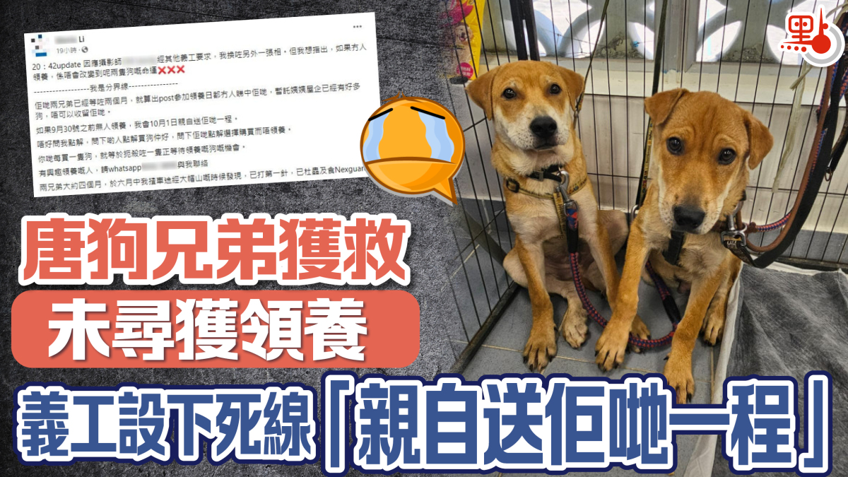 義工拯救流浪貓狗後,都希望為牠們覓得好主。不過,近日一名義工在社交平台發文為一對流浪唐狗尋找主人時,竟設下「死線」,稱如果死線前無人領養,將會「親自送佢哋一程」,帖文引起一眾網民怒火。