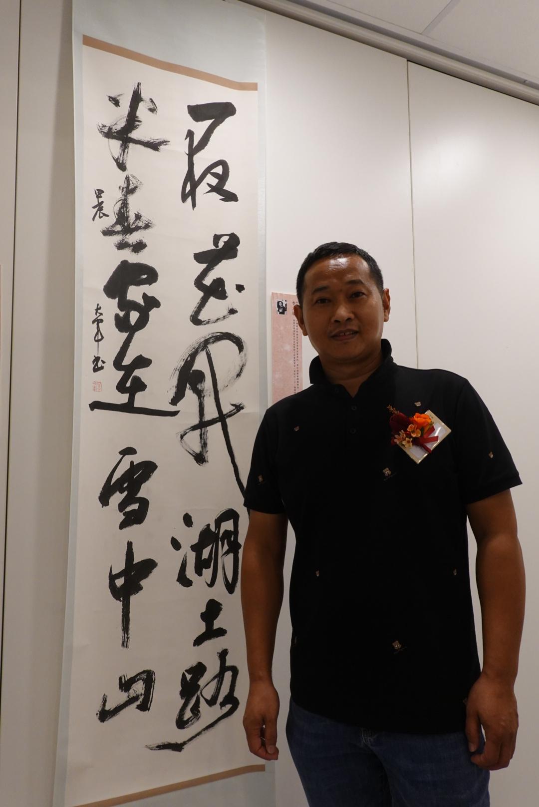 珠海香洲區書協副主席李大軍則帶來一幅草書對聯,作品尺幅較小,但大氣蓬勃:「小作品也要力求寫出大氣象,因此我在其中呈現了濃淡筆墨的對比、字的大小變幻、亦正亦斜。」他指即使是在內地,亦很少見專門的草書大展,因草書創作是「一瞬間的藝術」,書法家也難以一次寫就,而且創作也需要情緒的積累與醞釀。「觀眾若要從技法方面欣賞草書,難度比較高,甚至識別都很困難。但可以將這些書寫看成是筆墨跳舞的藝術,便能感受到那種視覺美感,草書有它獨特的動感和韻律。」李大軍說。