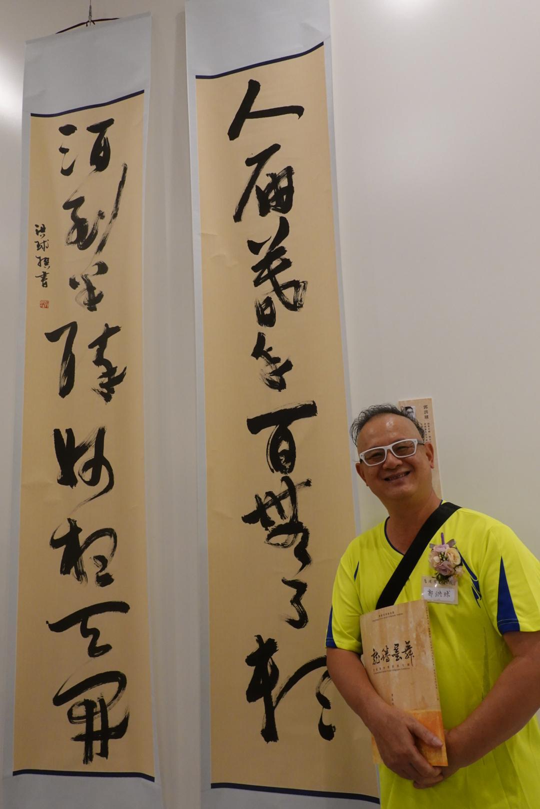 書法家郭洪球的作品寫的是他自己所作的對聯:人屆暮年百無了賴,酒到半醉妙想天開。「這兩句是我在坐地鐵的時候想到的,算是我當下的生活感悟。書法是我抒發感想、調劑心靈的方式,而草書寫出來更是情感的表達,所書即是所感。」郭洪球表示,許多人都將書法看作是視覺藝術,但他認為草書更是一種人文藝術。「我們追求的是心靈、思想與哲學上的表達。在欣賞時,我希望觀眾也可以關注草書的內容表達,因為那關聯著書寫者的情感。」