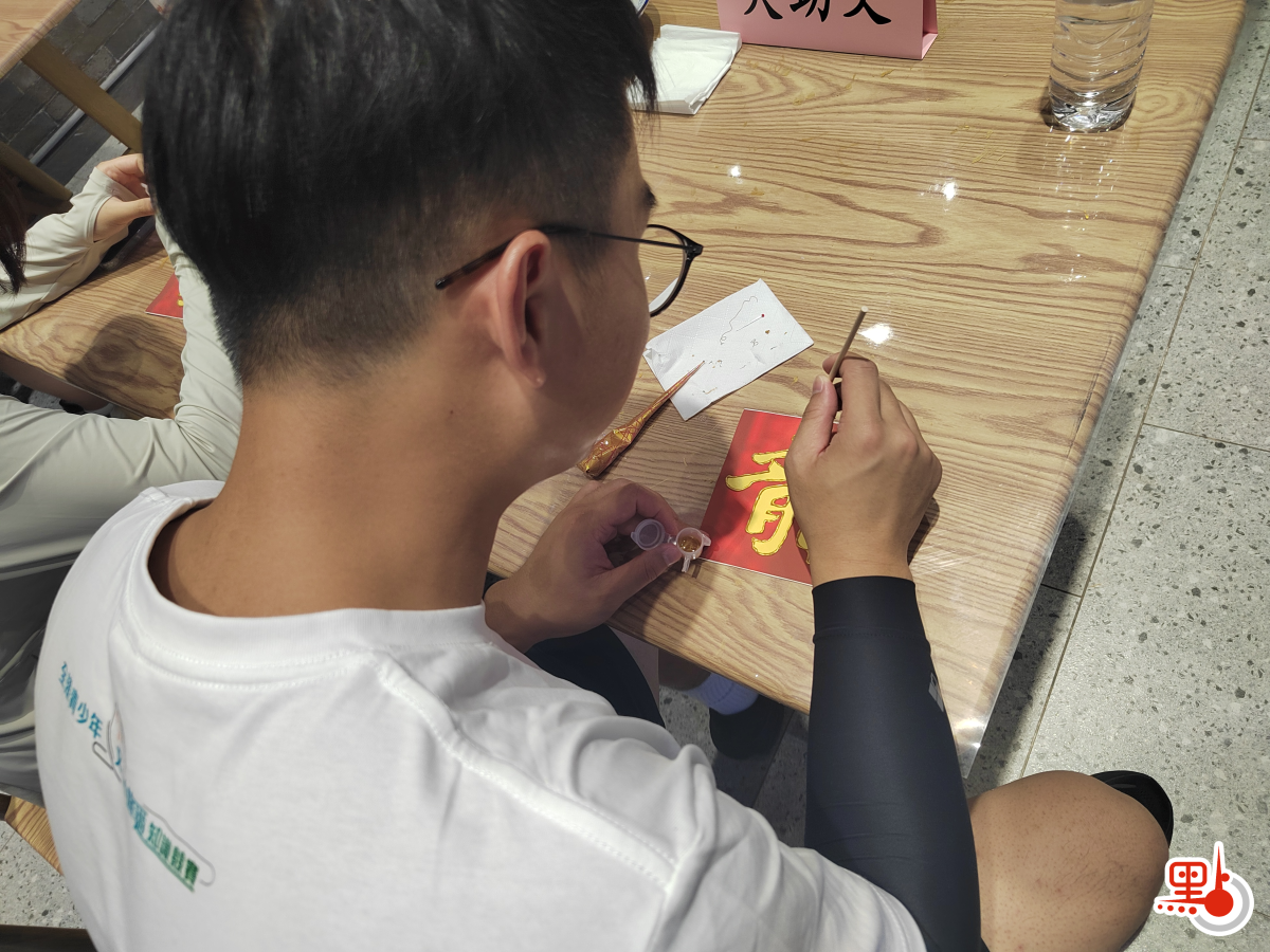活動的第一場驚喜,就是非遺體驗瀝金彩繪。瀝金彩繪被戲稱為「中式裸眼3D繪畫技術」,古代多用於寺觀宮殿的樑柱彩繪和大殿壁畫中。山西元代的永樂宮《朝元圖》和北京明代的法海寺壁畫中,都完美的使用了這一繪畫技術。