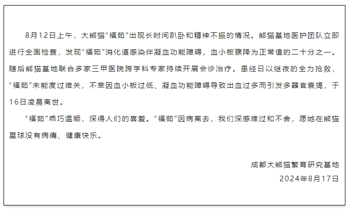 【點新聞報道】據成都大熊貓繁育研究基地8月17日消息,8月12日上午,大熊貓「福茹」出現長時間趴臥和精神不振的情況。熊貓基地醫護團隊立即進行全面檢查,發現「福茹」消化道感染伴凝血功能障礙,血小板驟降為正常值的二十分之一。隨後熊貓基地聯合多家三甲醫院跨學科專家持續開展會診治療。雖經日以繼夜的全力搶救,「福茹」未能度過難關,不幸因血小板過低、凝血功能障礙導致出血過多而引發多器官衰竭,於16日凌晨離世。