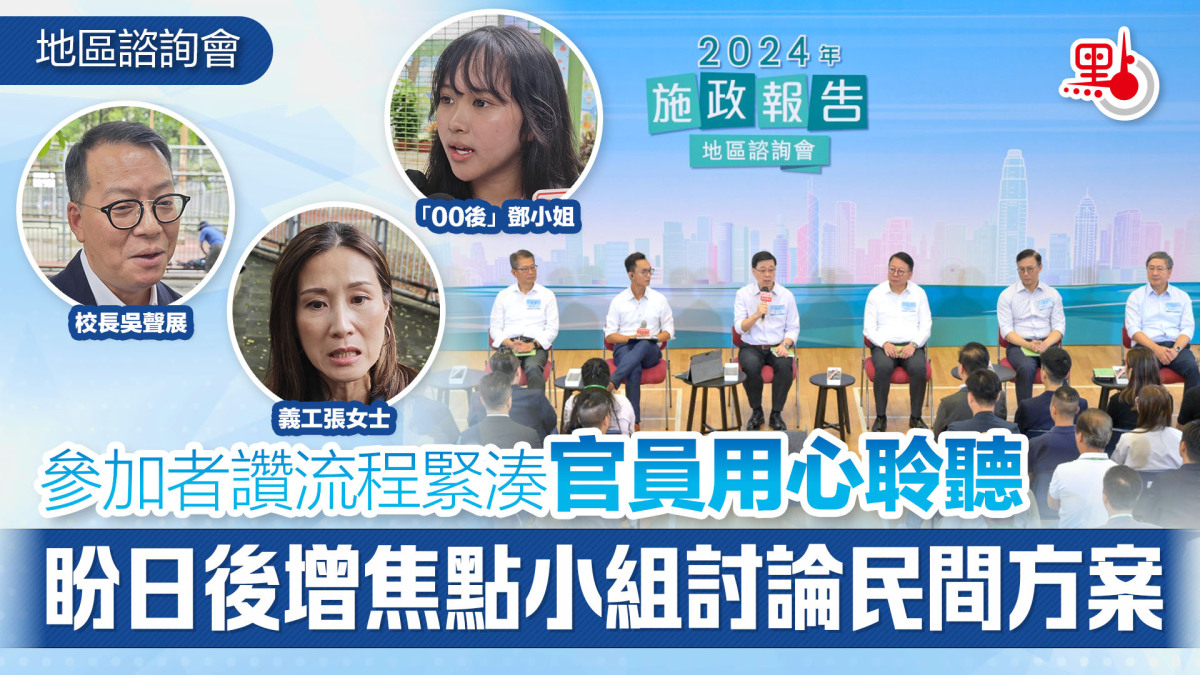 「00後」青年鄧小姐形容,是人生首次親眼見到特首和司局長級官員回應提問,心情一度緊張和興奮,惟很快就調整過來,對諮詢會氣氛感到舒服,各方可以自由地表達意見。若然個別參加者沒有足夠時間發言,主辦方也有提供紙本,便利參加者提供書面回應,非常細心。
