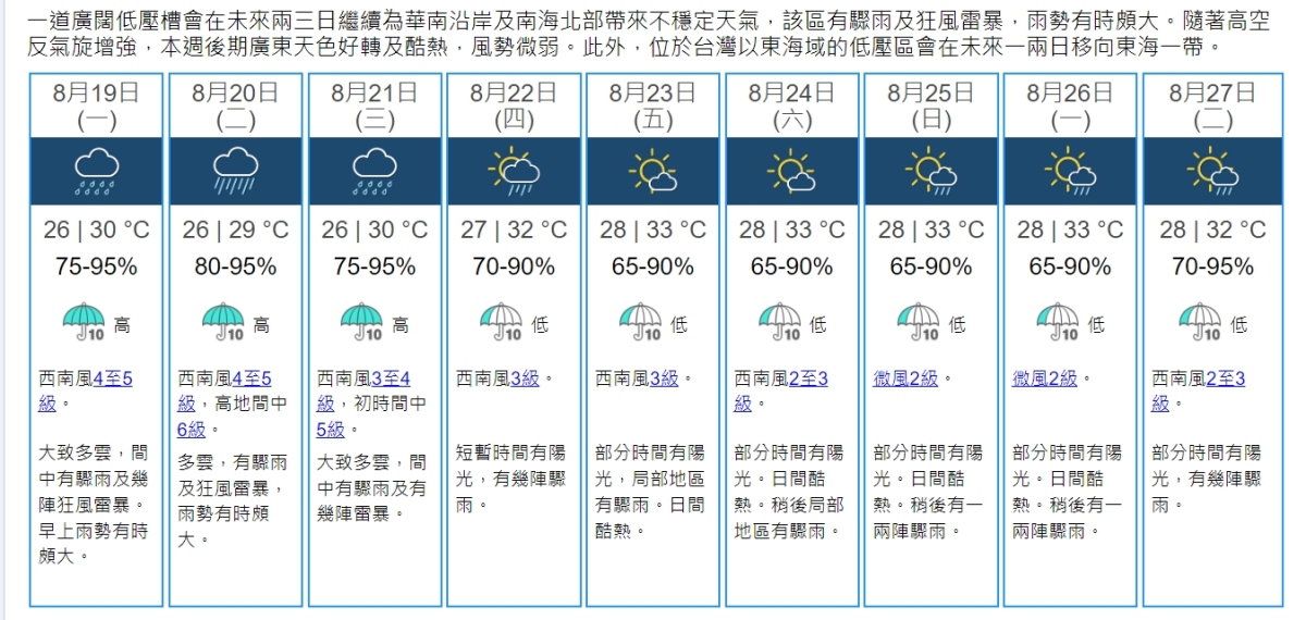展望未來,隨後一兩日天氣仍然不穩定,雨勢有時頗大及有狂風雷暴。本周後期驟雨逐漸減少,天色好轉。隨着高空反氣旋增強,本周中廣東天色好轉及酷熱,天文台預測新一輪熱浪在周四(22日)二十四節氣「處暑」開始,周末至下周初市區氣溫最高攝氏33度。