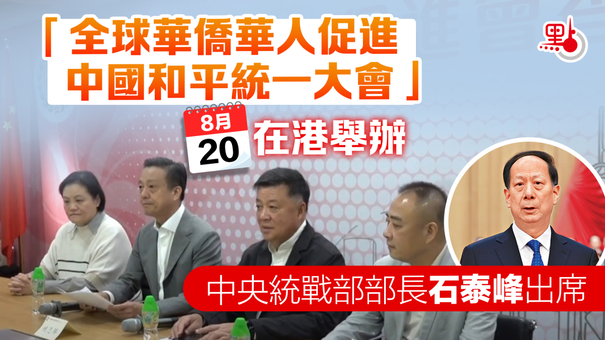 全國政協常委、中國和平統一促進會香港總會會長姚志勝宣布,「全球華僑華人促進中國和平統一大會」明日(20日)舉行,大會主題是「堅定不移推進中國和平統一,致力實現中華民族偉大復興」。中共中央政治局委員、中央統戰部部長石泰峰將會出席大會並致辭。