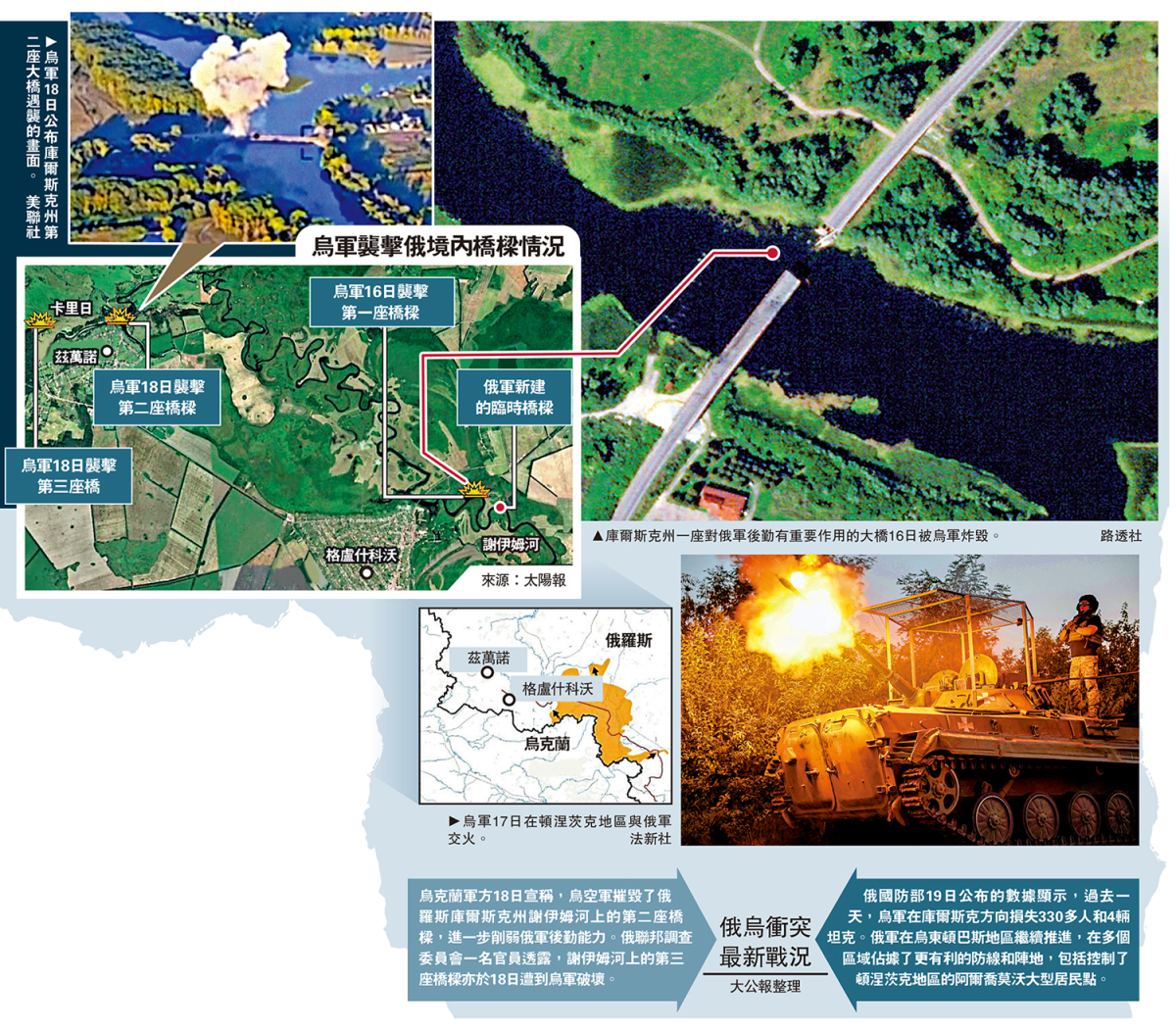 烏克蘭越境襲擊俄羅斯庫爾斯克州以來,俄烏雙方在當地持續激戰。18日,烏軍宣稱摧毀庫爾斯克州謝伊姆河上的第二座橋樑,進一步削弱俄軍後勤能力。俄聯邦調查委員會一名官員透露,謝伊姆河上的第三座橋樑當日亦遭到破壞。烏總統澤連斯基聲稱,烏軍進攻庫爾斯克的主要目的之一是在俄境內設立緩衝區。他要求美、英、法等西方國家加快武器供應。