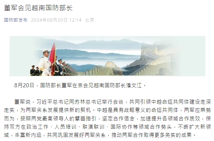 【點新聞報道】據國防部發布微信公眾號消息,8月20日,國防部長董軍在京會見越南國防部長潘文江。