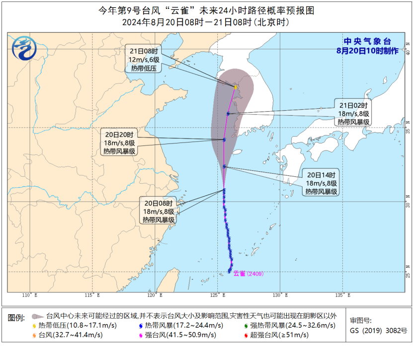 受其影響,今天8時至21日8時,黃海東南部、東海及釣魚島附近海域、台灣以東洋面、台灣海峽、南海東北部以及上海沿海、杭州灣、浙江沿海、福建沿海將有6至7級大風,「雲雀」中心經過的附近海域的風力有8級,陣風可達9至10級。