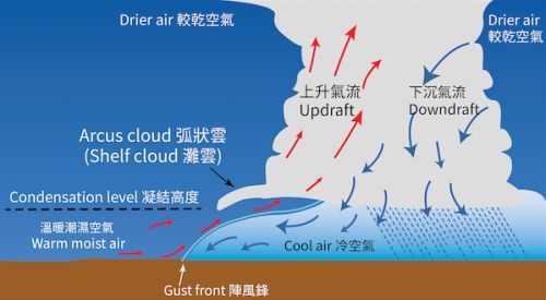 天文台解釋「弧狀雲」出現的成因,指結構成熟的積雨雲相關的強冷空氣急速地向下沉至地面時,會令周圍的暖濕空氣抬升、冷卻及凝結,在積雨雲前沿的底部形成。