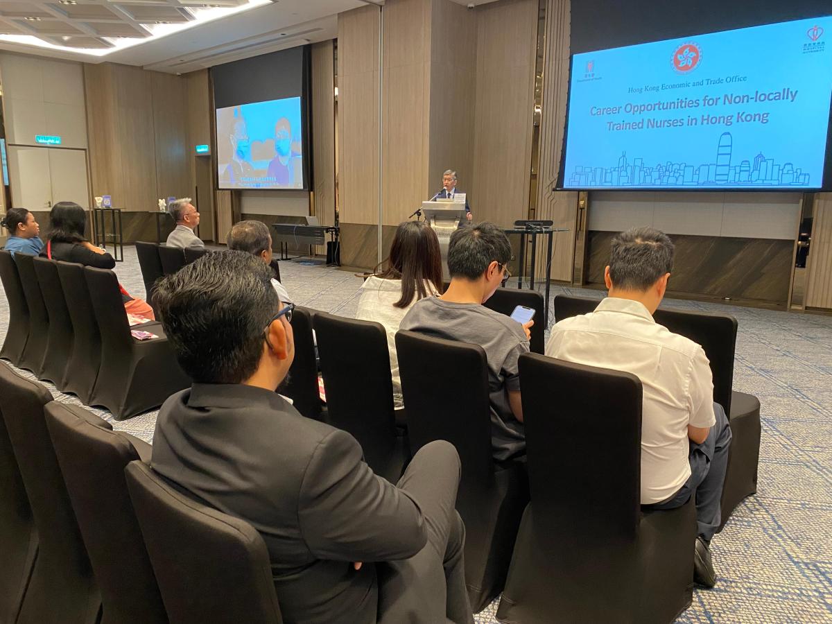 在香港駐雅加達經濟貿易辦事處(駐雅加達經貿辦)的支持下,醫管局代表團在吉隆坡舉辦招聘簡介會與當地護士見面交流,衞生署代表亦透過線上形式參與。代表團向當地護士介紹在最新政策下,合資格的非本地培訓護士可透過不同途徑,免考執業試加入本港公營醫療機構工作。