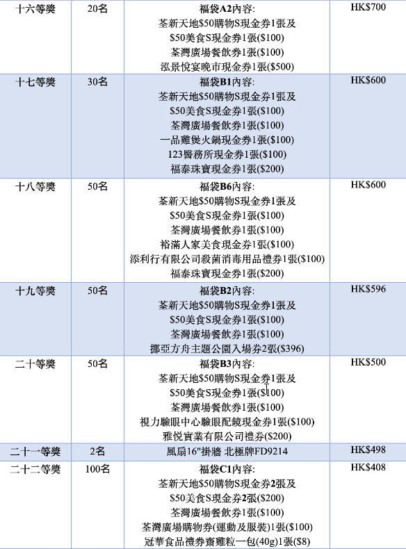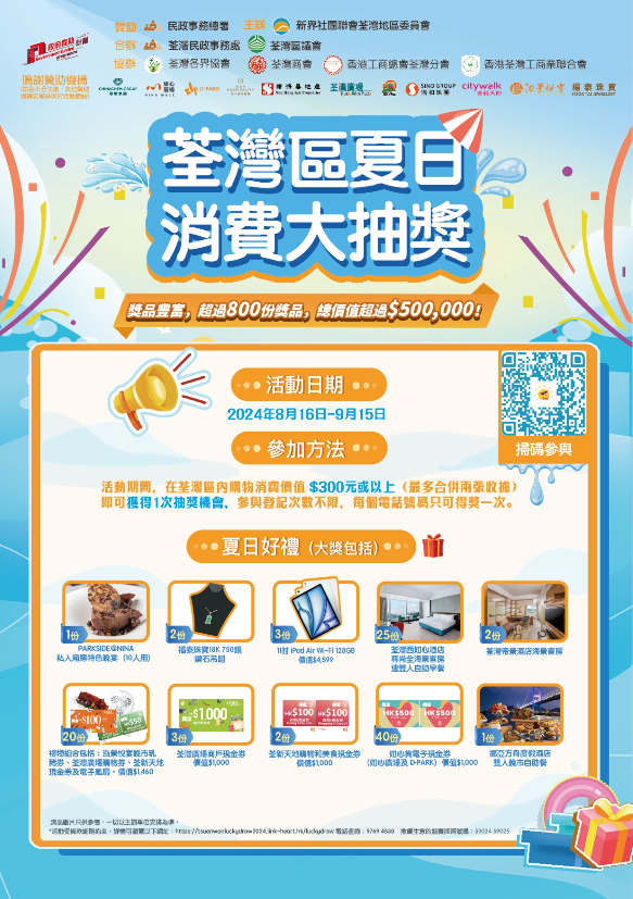 - 參加者於荃灣區商戶消費達港幣300元或以上,即可透過掃描活動二維碼或到指定網站登記參加大抽獎,登記次數不限,每個電話只可得獎一次;