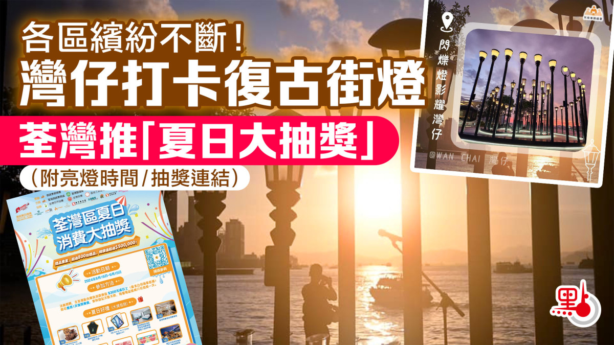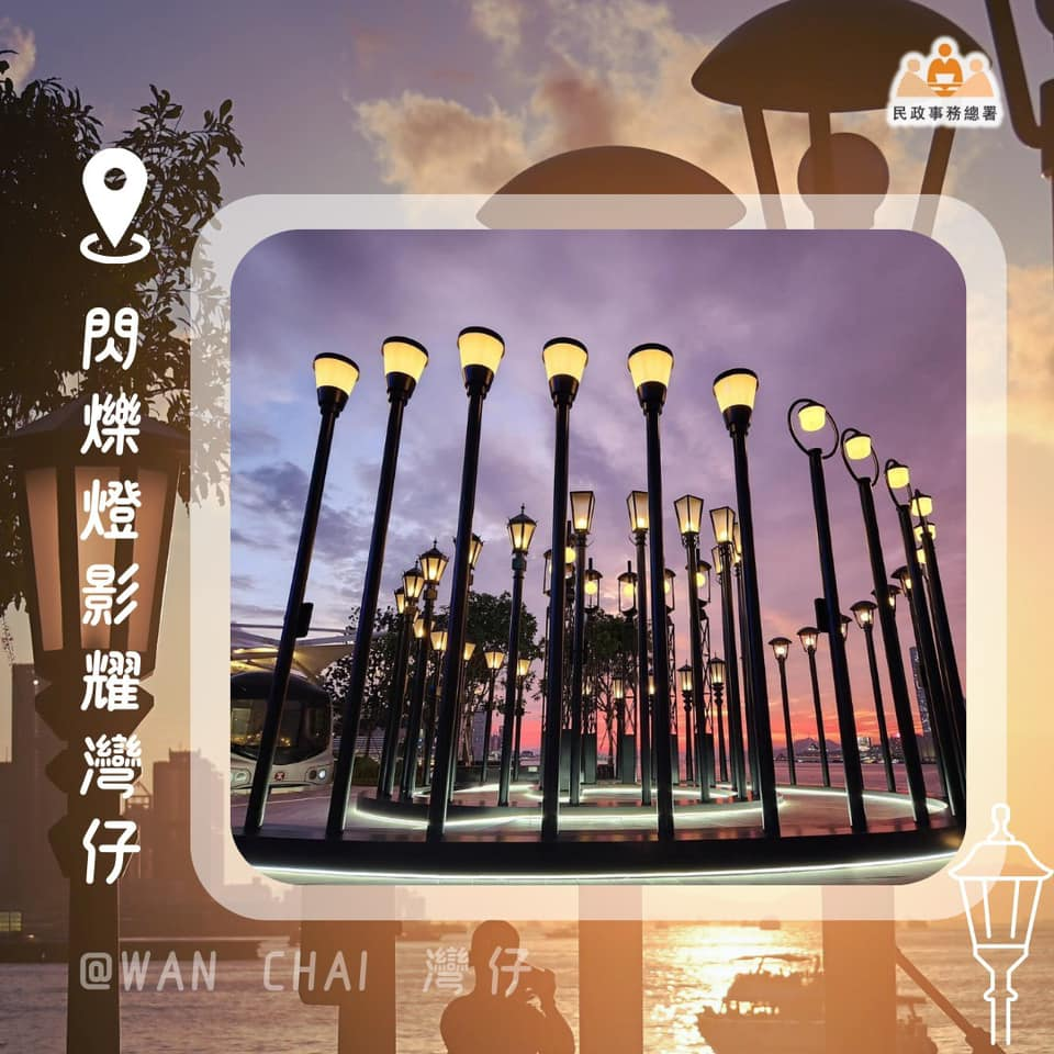 除了荃灣區的「夏日消費大抽獎」後,灣仔區亦舉辦「閃爍燈影耀灣仔」,在該區海濱長廊擺放50支復古街燈。閃耀燈光,搭配上斜陽晚煙,更添唯美浪漫情,難怪吸引不少市民、遊客以至攝影發燒友到場打卡留念。