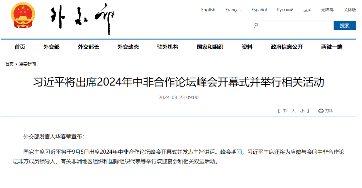 【點新聞報道】據外交部網站消息,外交部發言人華春瑩宣布:國家主席習近平將於9月5日出席2024年中非合作論壇峰會開幕式並發表主旨講話。峰會期間,習近平主席還將為應邀與會的中非合作論壇非方成員領導人、有關非洲地區組織和國際組織代表等舉行歡迎宴會和相關雙邊活動。