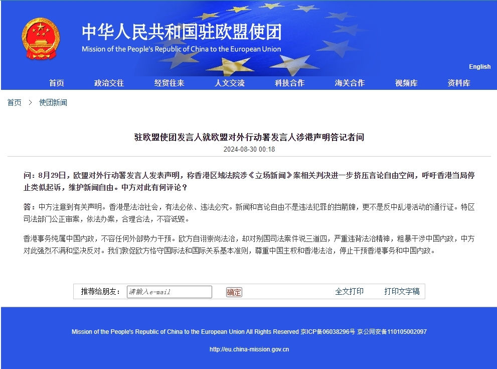 中國駐歐盟使團發言人表示,中方注意到有關聲明。香港是法治社會,有法必依、違法必究。新聞和言論自由不是違法犯罪的擋箭牌,更不是反中亂港活動的通行證。香港特區司法部門公正審案,依法辦案,合理合法,不容詆毀。