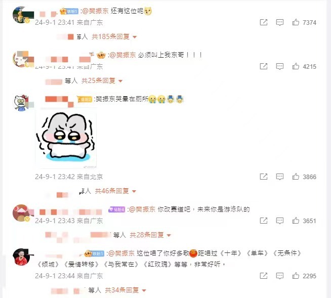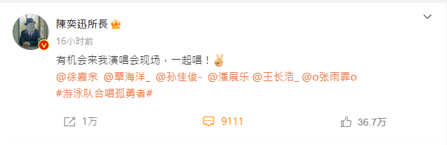 游泳隊成員紛紛現身Eason評論區留言。張雨霏直呼「老師,我們怕拖累你。」;孫佳俊化身迷弟曬陳奕迅武漢演唱會門票稱「Eason武漢我就去了,期待一起唱,真的超級喜歡你!」;潘展樂表示「一定要去一次!」;徐嘉余拿游泳隊玩梗說「這潑天的富貴啊,我們是不是得一起來孤勇一下!」;王長浩發問「老師能帶我們飛嗎?」;覃海洋亦承諾「一言為定!哥!(我可以再獻唱一首陰天快樂)」。