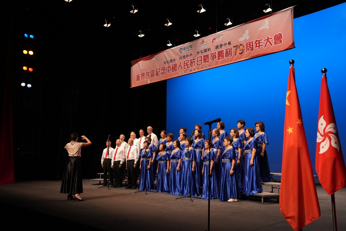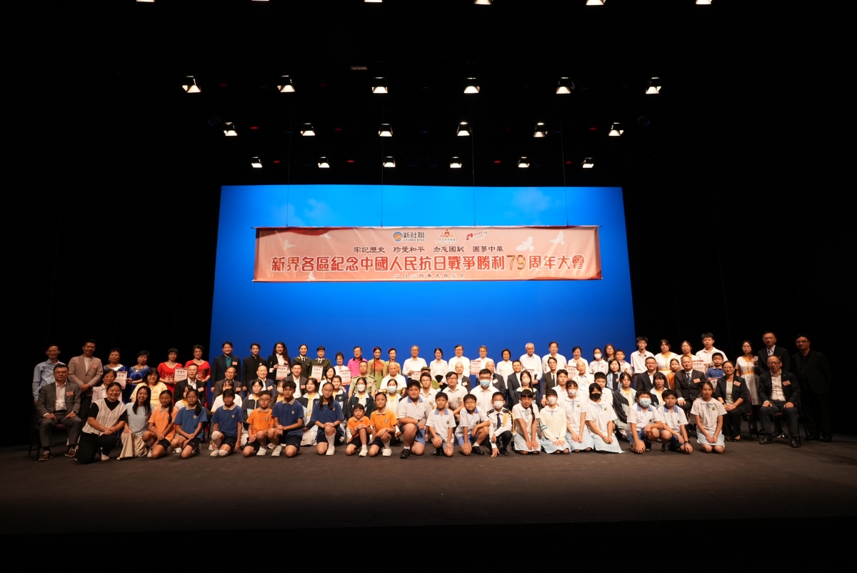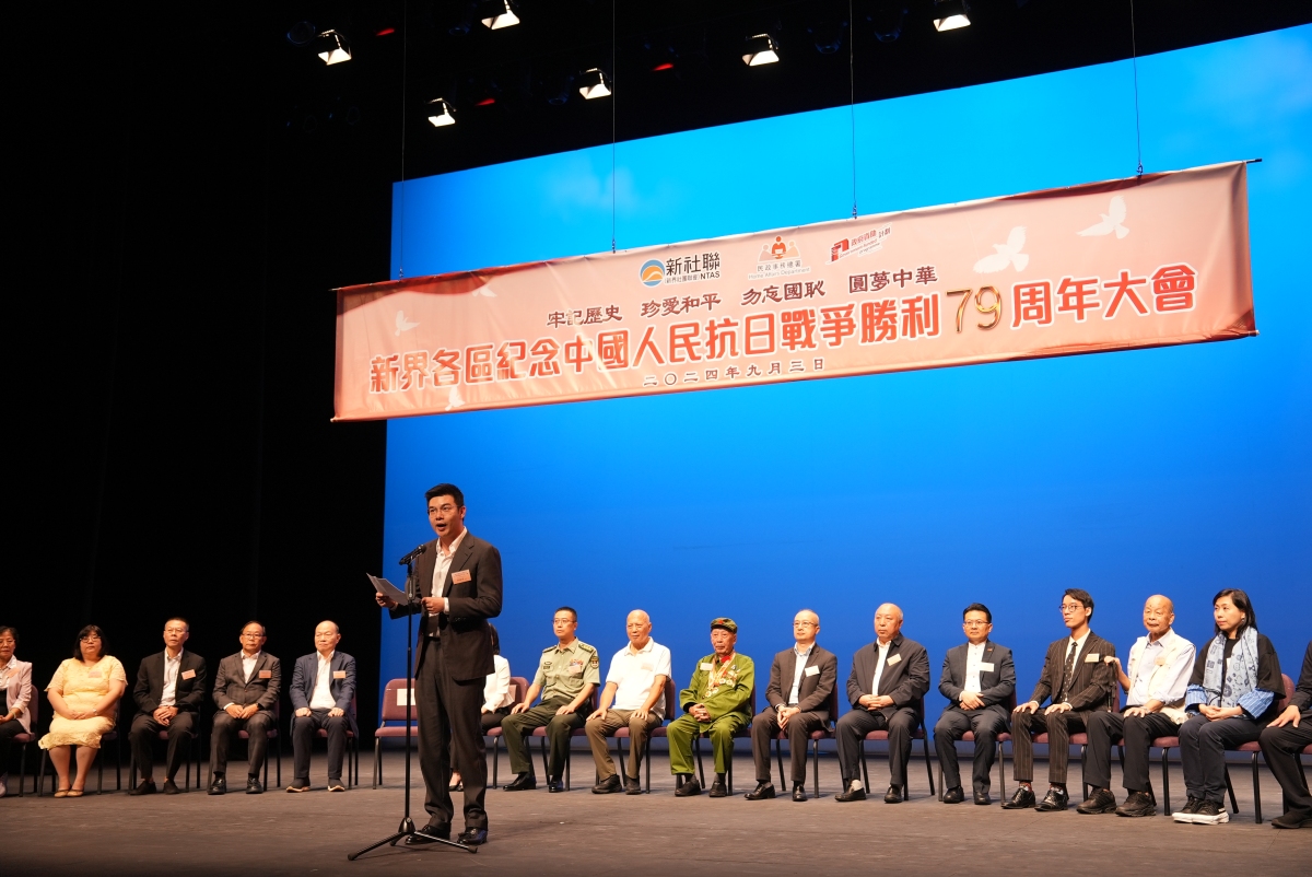 【點新聞報道】2024年9月3日,新界社團聯會與民政事務總署聯合舉辦了「新界各區紀念中國人民抗日戰爭勝利79周年大會」。中央政府駐港聯絡辦新界工作部部長李薊貽、民政事務總署署長張趙凱渝、中國人民解放軍駐香港部隊陸軍部隊井紹慶上校及廣東省退役軍人事務廳副廳長李克強等擔任主禮嘉賓,港區全國人大代表召集人、新界社團聯會會長陳勇,新界社團聯會理事長譚鎮國及現場逾650位社會各界人士出席。大會上特別向出席活動的老戰士梁平及老烈屬麥沃田獻上鮮花致謝。