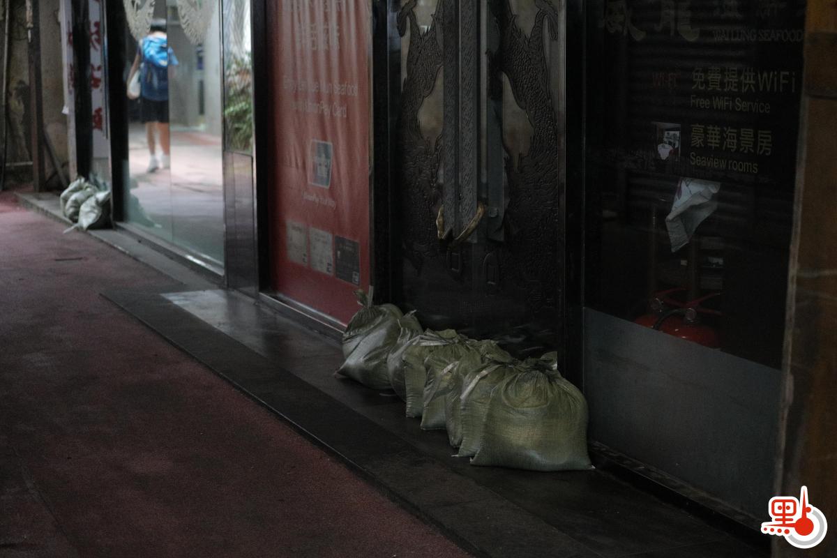記者留意到,許多餐廳、雜貨店、魚檔等店舖已提早關門,有酒樓甚至沒有營運,僅把沙包堆放在出入口前。亦有酒樓改用擋水板,大家各施各法,期望減少颱風帶來的經濟損失。