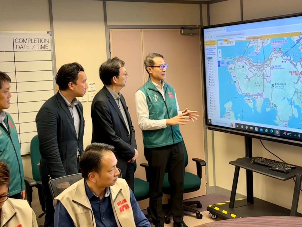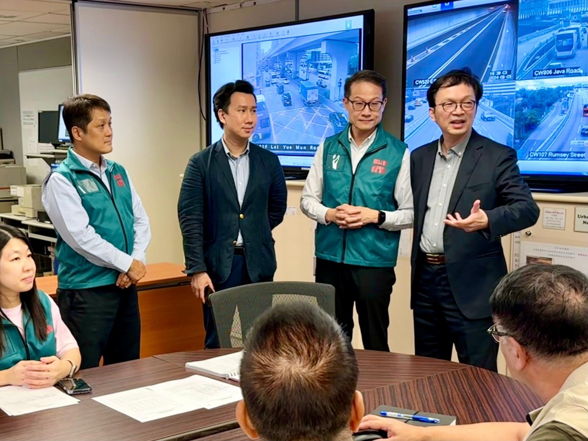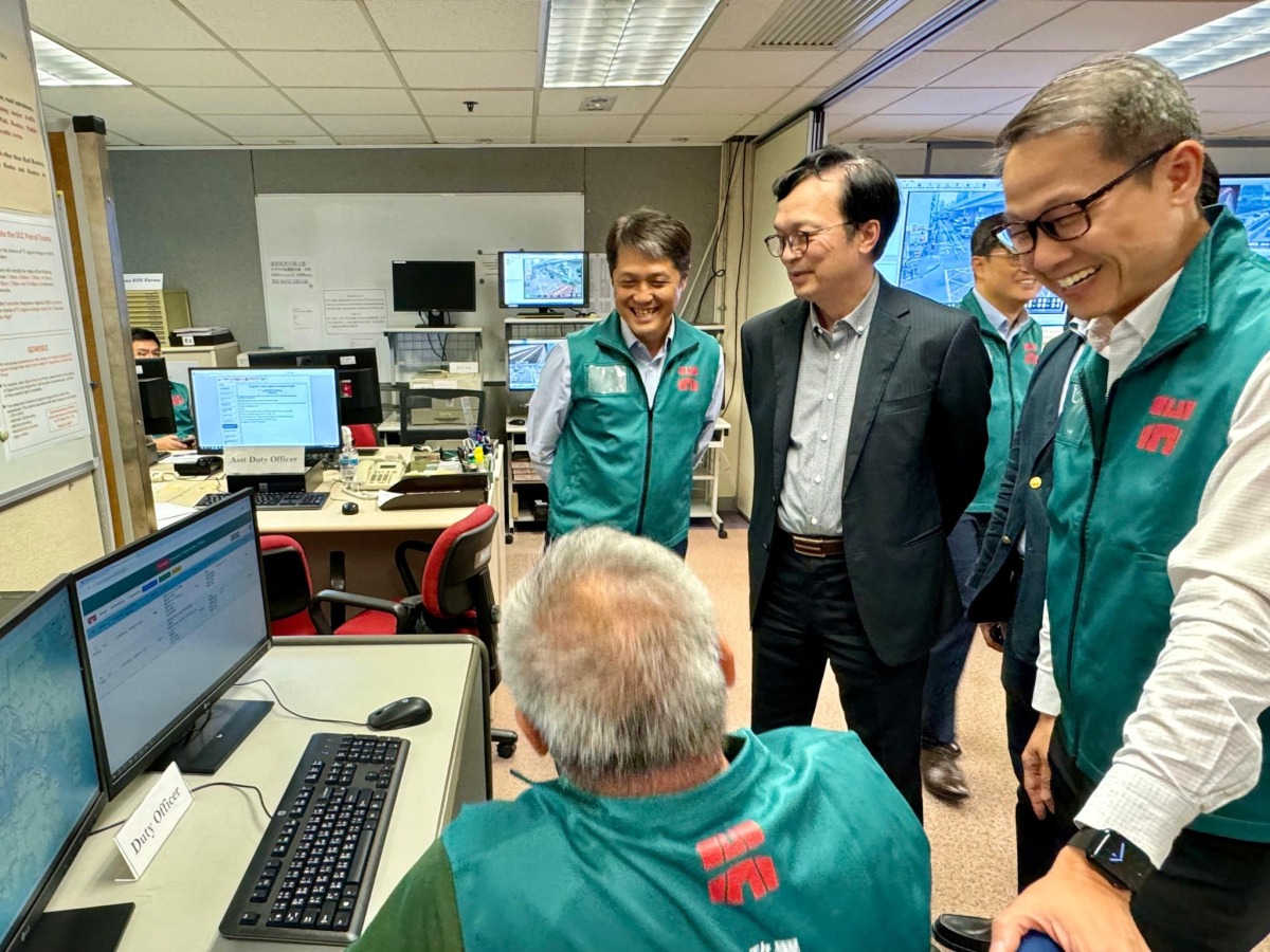 【點新聞報道】颱風「摩羯」襲港,八號烈風或暴風信號現正生效。運輸及物流局與轄下部門做好準備工作,前線人員於風暴期間緊守崗位,全面保障海陸空交通安全。今日(9月5日)下午,運輸及物流局副局長廖振新和政治助理陳閱川到訪港島區路政署緊急控制中心,了解部門應對風暴的預防、應急及善後工作。