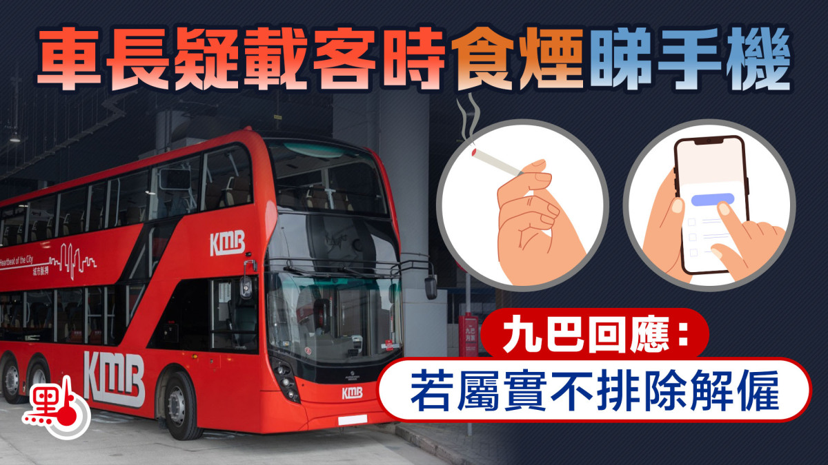 九巴回覆傳媒查詢時表示,昨晚一名車長在屯門公路駕駛59M線巴士時,懷疑吸煙和觀看手提電話。九巴已即時暫停該名車長職務,正在進行全面調查,若證明屬實,將嚴肅處理並採取紀律行動,不排除作出解僱。
